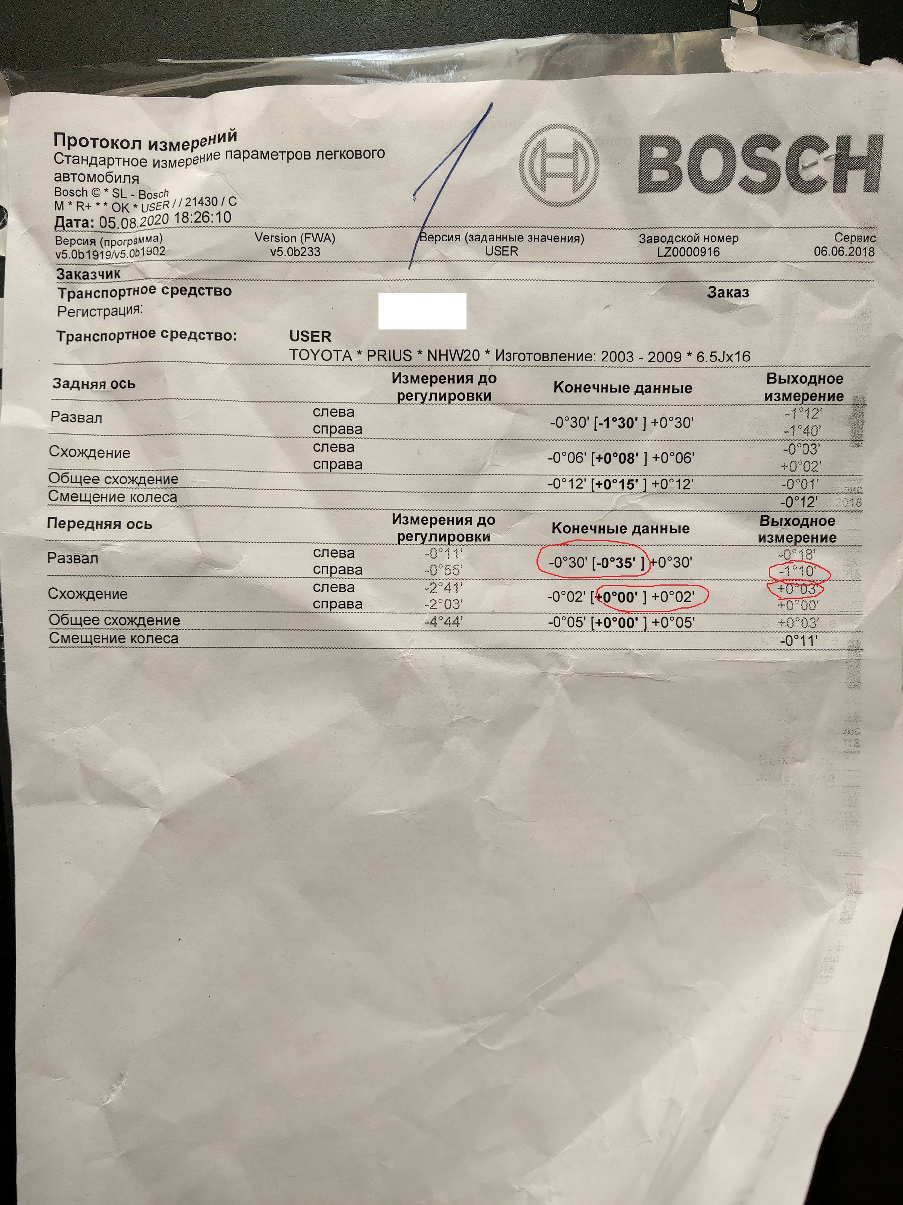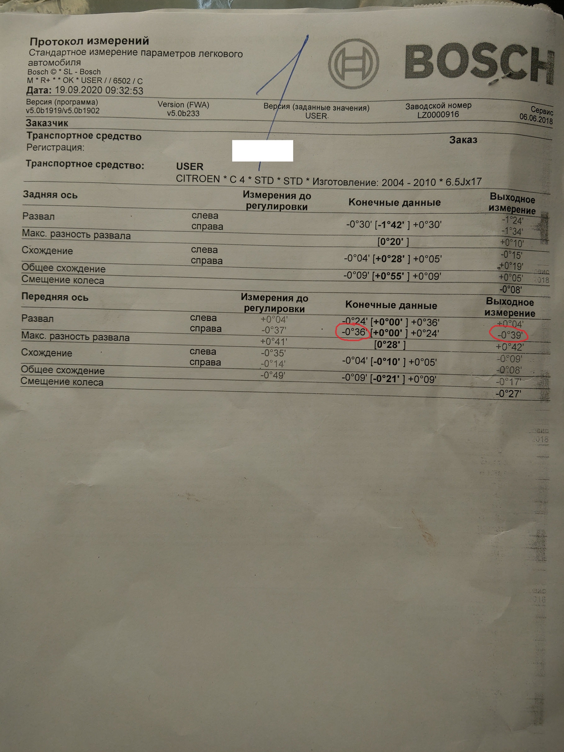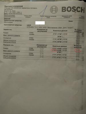Неоднократно ездил на сервис на развал, последний раз был вчера на Citroen. Сегодня посмотрел на распечатку - увидел что на самом деле по результатам Развал передняя ось справа не в зоне допуска (-0,39 вместо предельного -0,36). Еще и модельный год неверно указан (авто 2011 г.в., указано 2004-2010 г.в.). Посмотрел предыдущую распечатку, что делал месяц назад на другом авто (Toyota) - там на передней оси схождение слева вне пределов (-0,03, предел -0,02), а тот же развал справа вообще плохо выставлен (-1,10 вместо предела -0,65)... как так-то?