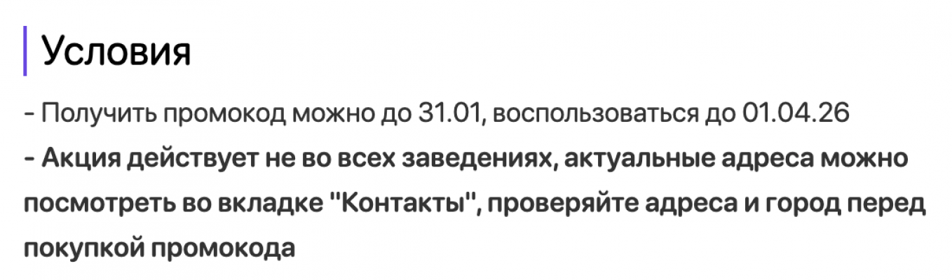 - Акция действует не во всех заведениях, актуальные адреса можно посмотреть во вкладке "Контакты", проверяйте адреса и город перед покупкой промокода