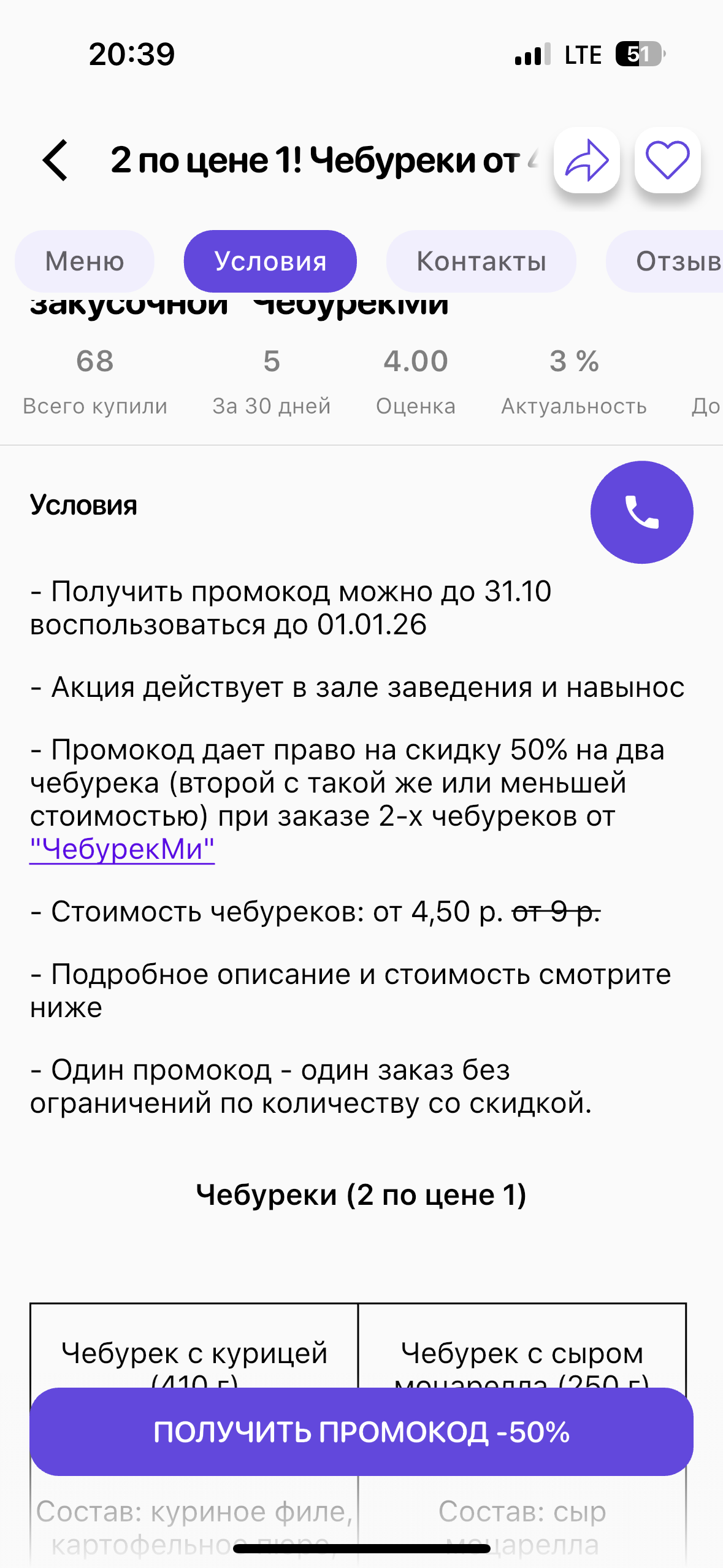 Сами чебуреки очень вкусные, сочные. Но условия акции указаны неверно. В условиях написано, что один промокод - один заказ без ограничений по количеству, но по факту другое. Хотели взять 4 чебурека, а на кассе потребовали 2 промокода, сказав, что условия акции придумывают не они и поделать ничего не могут, мол 1 промокод - только 2 чебурека. Пришлось брать еще промокод. С учетом стоимости промокодов акция не такая и выгодная получается. В общем за чебуреки 5, но минус звезда за введение в заблуждение покупателей.