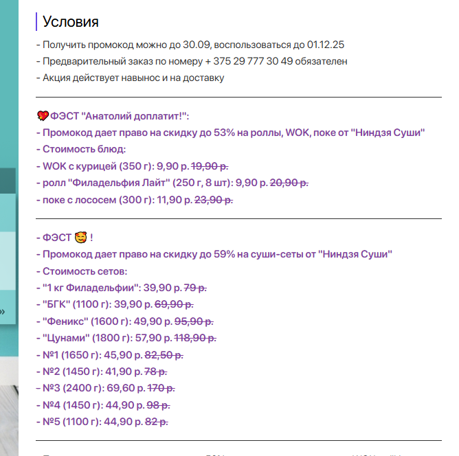 Добрый день! Спасибо за ваш вопрос. Мы хотим пояснить, что в условиях акции всегда указывается максимальная возможная скидка, а также минимальные цены на блюда, в данной акции минимальные цены доступны при самовывозе. Разница в итоговой стоимости при выборе доставки или самовывоза обусловлена применением различных процентов скидки. Предоставляется более высокий процент скидки на самовывоз, чтобы сделать этот способ получения заказа максимально привлекательным. При этом доставка также позволяет сделать очень выгодный заказ, хотя и с чуть меньшей скидкой. Что касается условий доставки: минимальная сумма заказа после применения всех скидок должна составлять 40 рублей, и при этом сама доставка будет для вас бесплатной. Надеемся, это проясняет ситуацию!