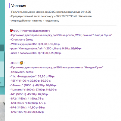 В скрине условия акции: доставка бесплатная от 40р, акция действует на доставку и самовывоз, цены указаны.