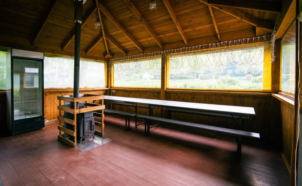 Это закрытая отапливаемая беседка с зоной барбекю и летней мойкой, рассчитанная на компанию до 50 человек.