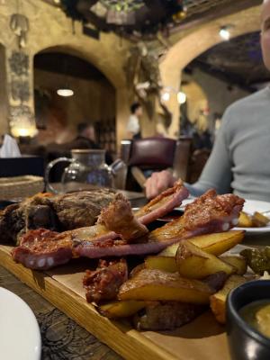 Не оправдал ожиданий сет Мясной совсем, с рульки вышло по 100 гр мяса на 4х., также по одной картошине, и четвертине огурчика (очень вкусный), на всех еще ложка марковки и капусты. Ребра внимания детей не привлекли, все 4 ребрышка разделены, срезано все, обычно такие наборы для собачников по рублю за кило продают. Заявленные 2 кг по ходу всесте с доской на которой все подается. Ребенок 12 лет не наелся и резюмировал, что лучше бы по шаурме сьели.
