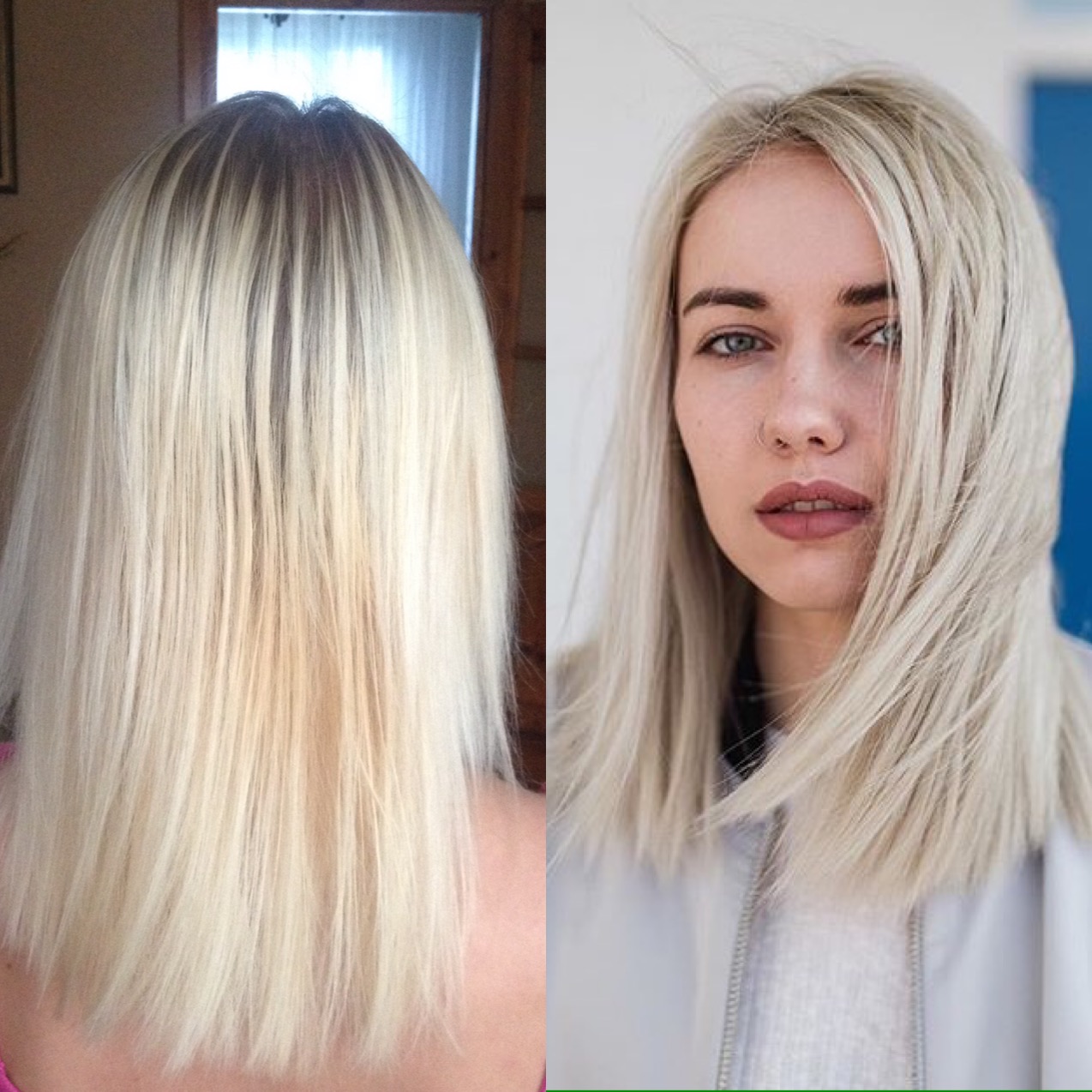 Итог: полностью окрашены корни в ЖЕЛТЫЙ цвет, тонировка- слегка пепельная, которая ложится лишь на длину.