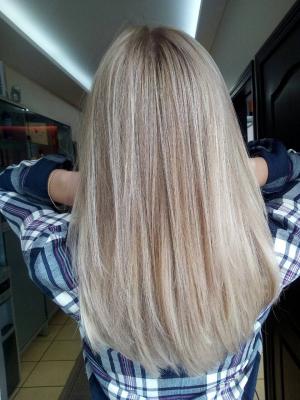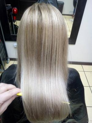 при окраске волос ниже лопаток, волос не густой, блондинка
