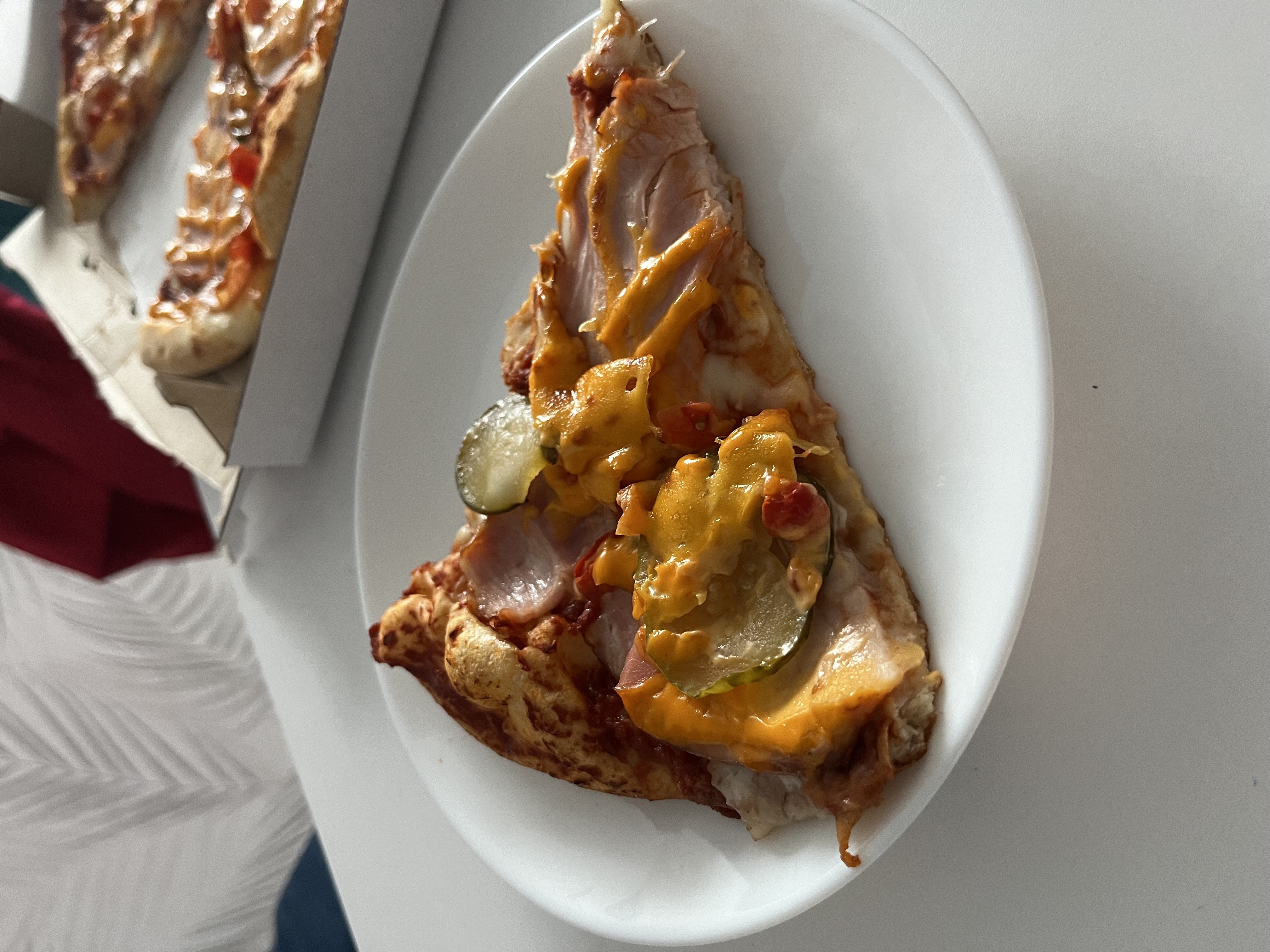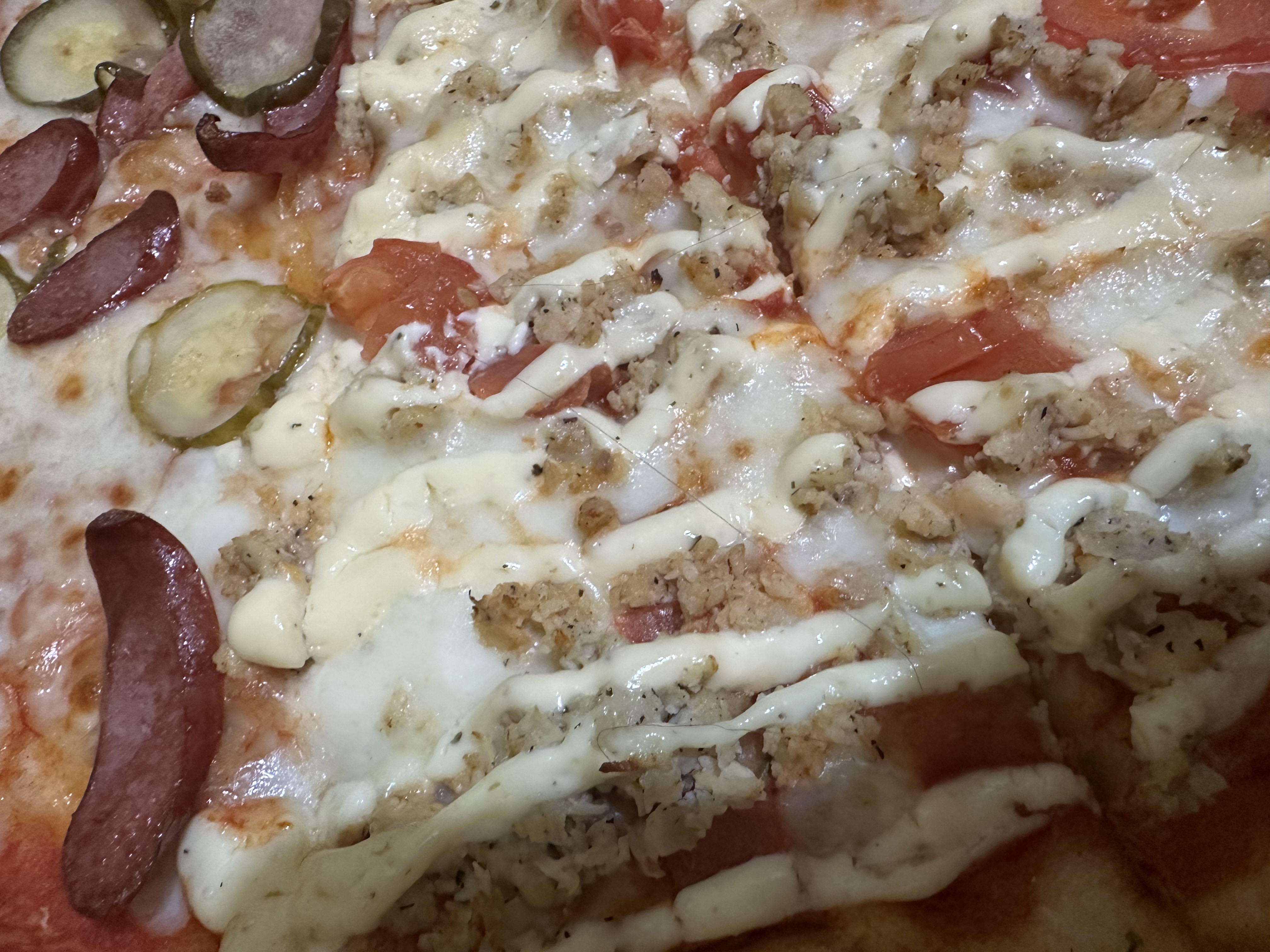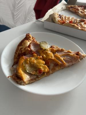 Состав: моцарелла, пицца-соус, ветчина, бекон, томат, огурец маринованный, чеддер, соус бургер