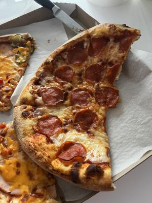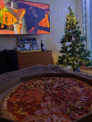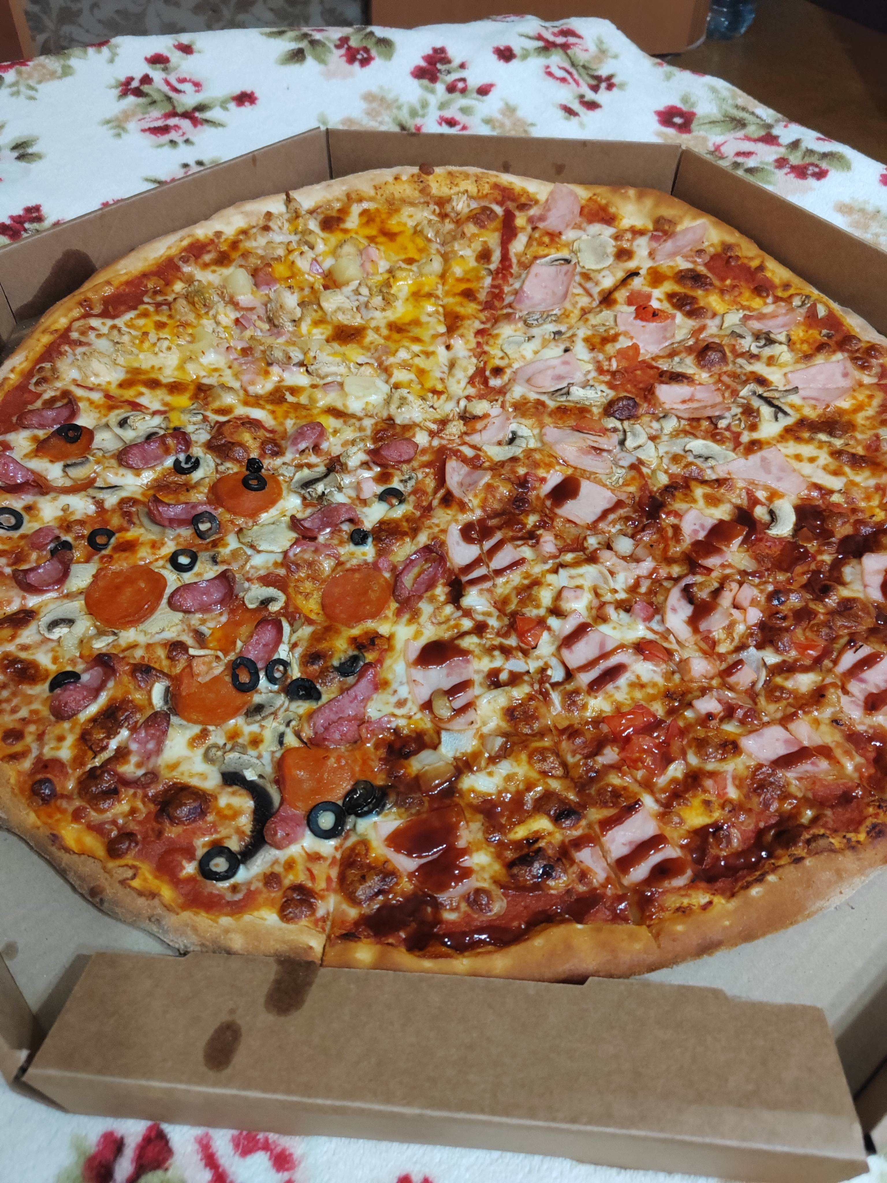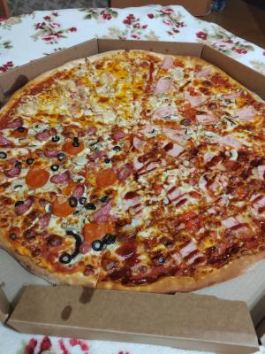 - мега-пицца "Компанейская" (60 см, 2000 г): моцарелла, пицца-соус, помидор, ветчина куриная, пепперони, бекон, лук маринованный, колбаски охотничьи, огурцы маринованные