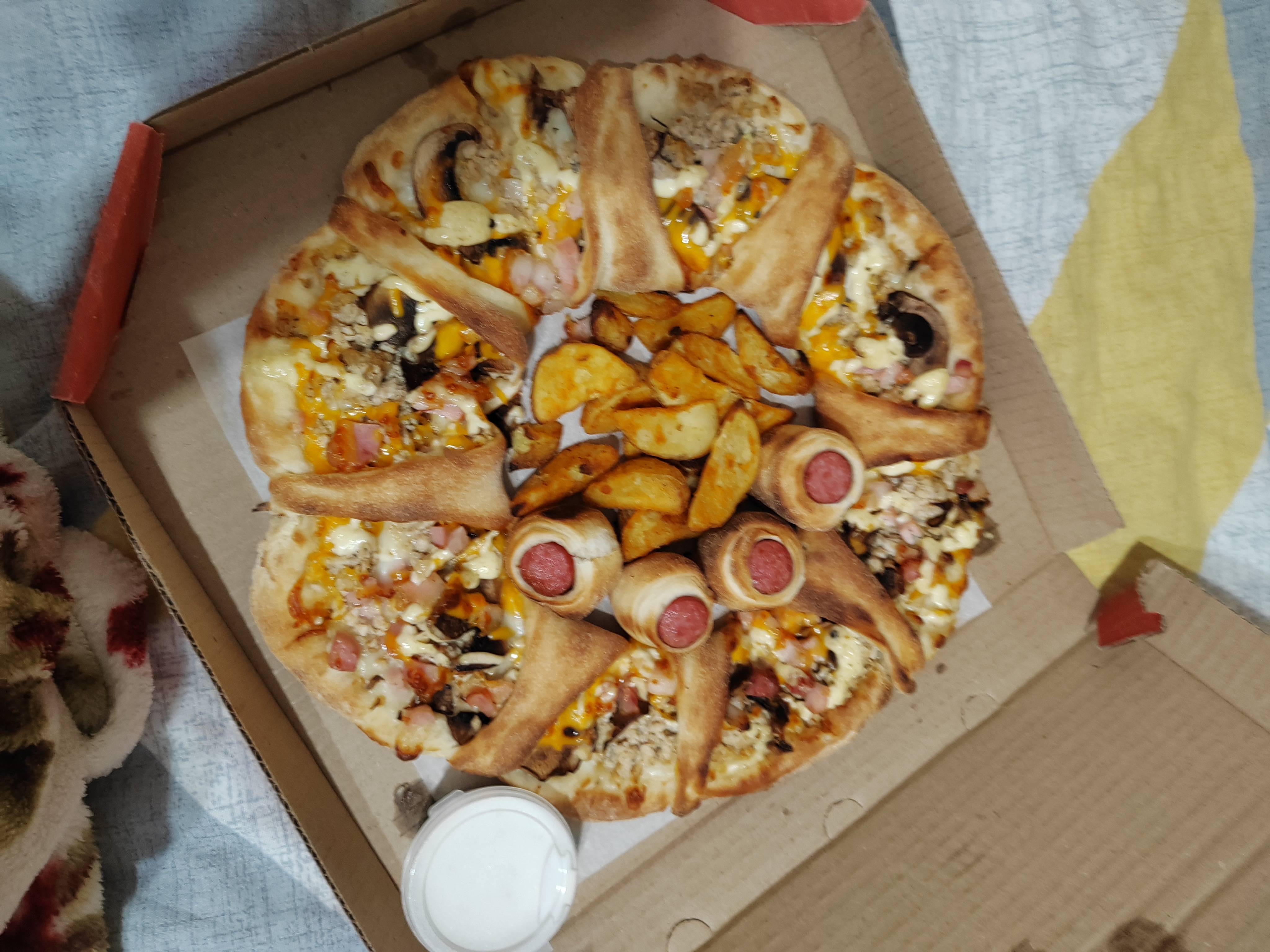 Состав: моцарелла, чесночный соус, кетчуп, ветчина, грибы, пепперони, курица, томат, фета