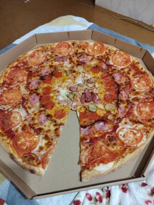 Состав: моцарелла, ветчина, грибы, колбаски охотничьи, огурец, курица, помидор, пепперони, перец сладкий, салями, перец халапеньо