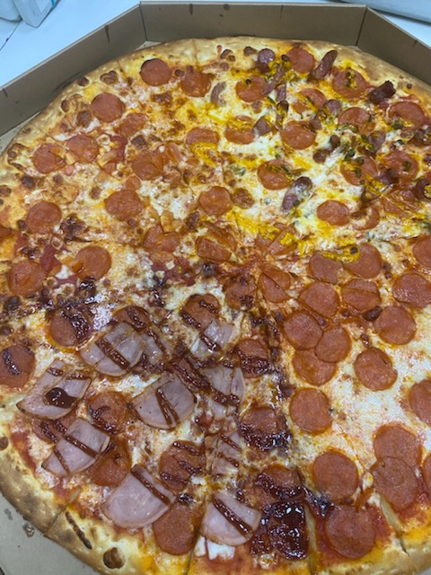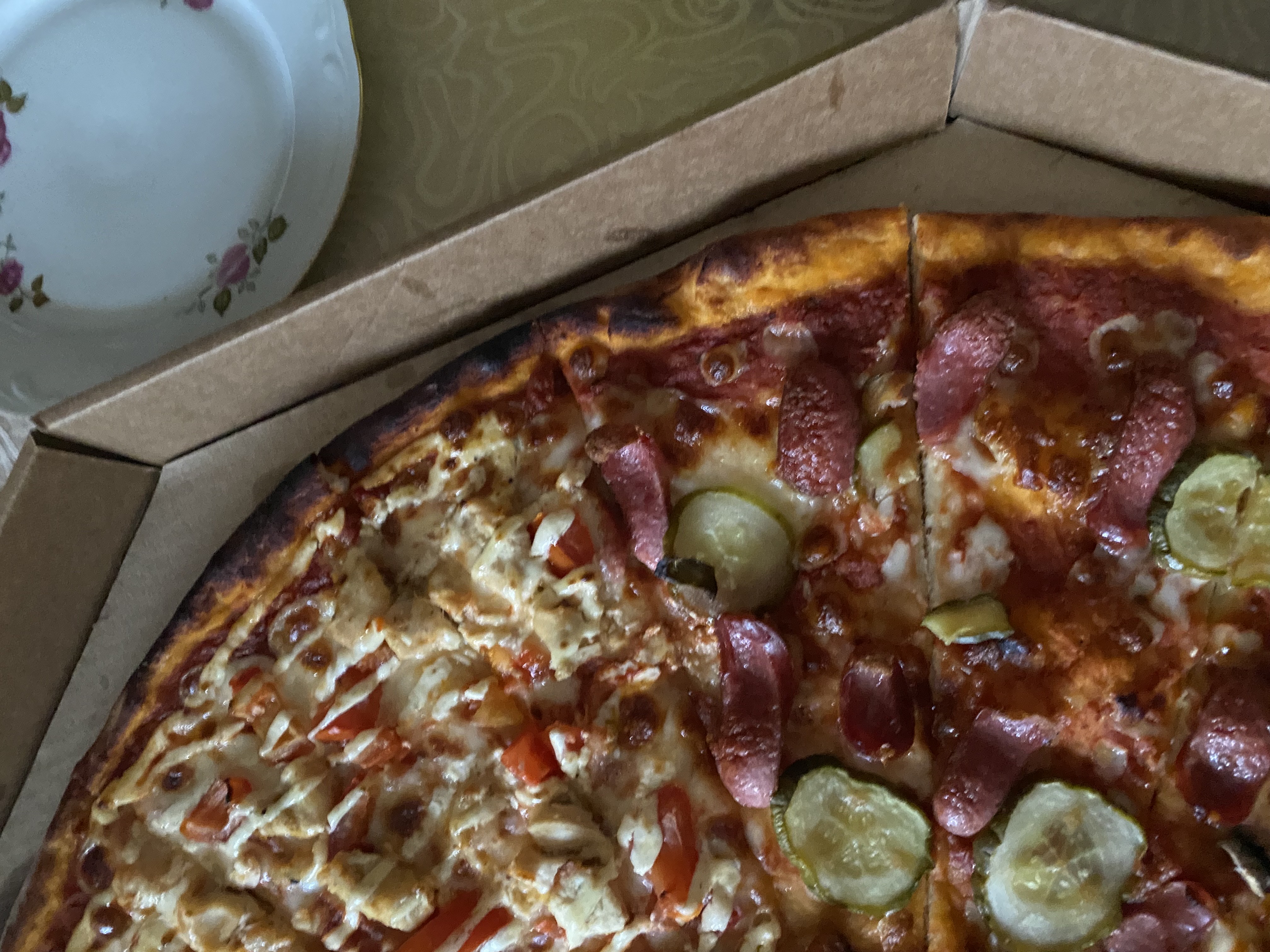 Состав: моцарелла, пицца-соус, ветчина, бекон, томат, огурец маринованный, чеддер, соус бургер