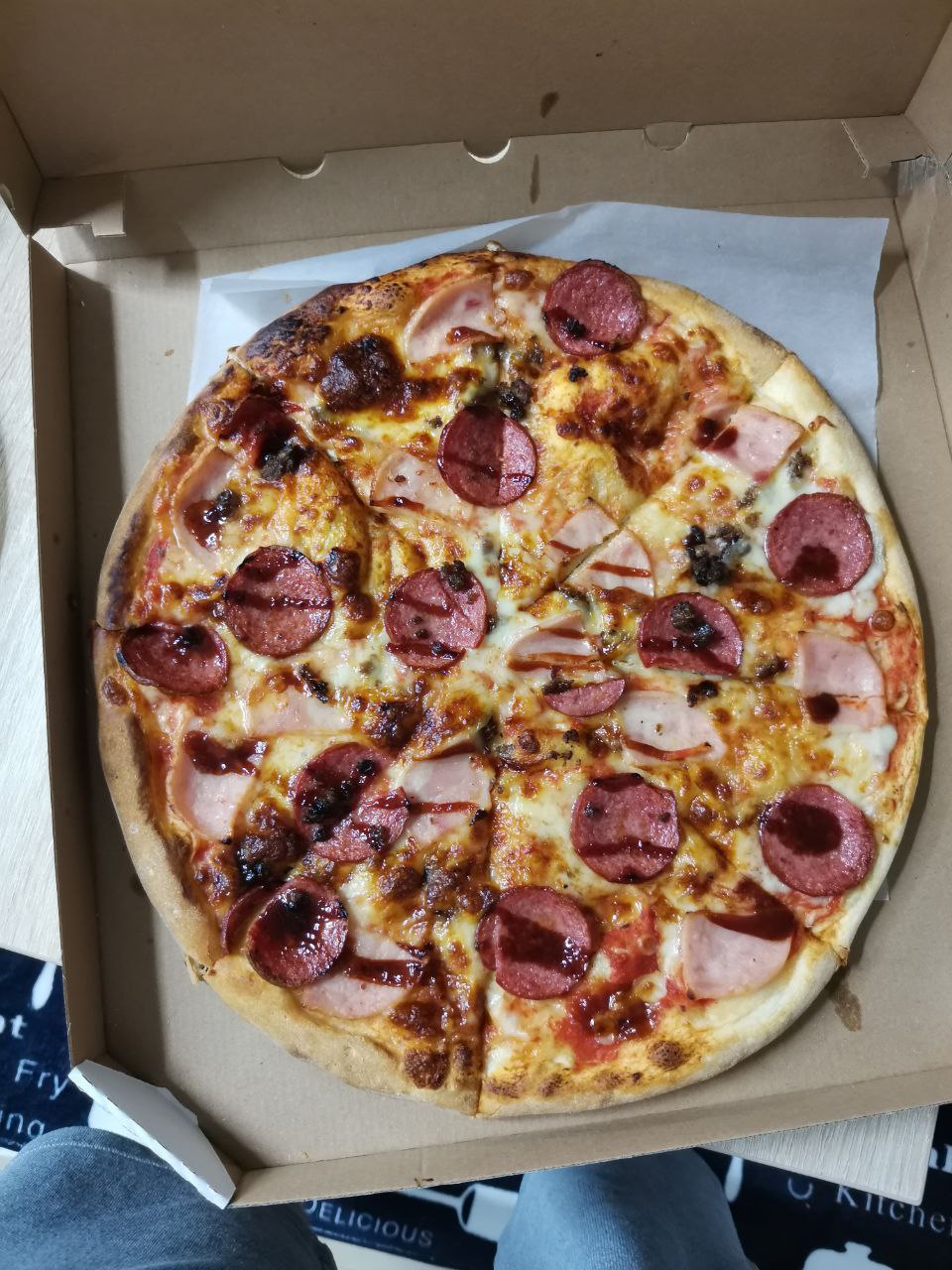 Состав: пицца-соус, моцарелла, бекон, куриная ветчина, колбаски охотничьи, салями, пепперони, помидор, огурец маринованный, маслины, соус бургер