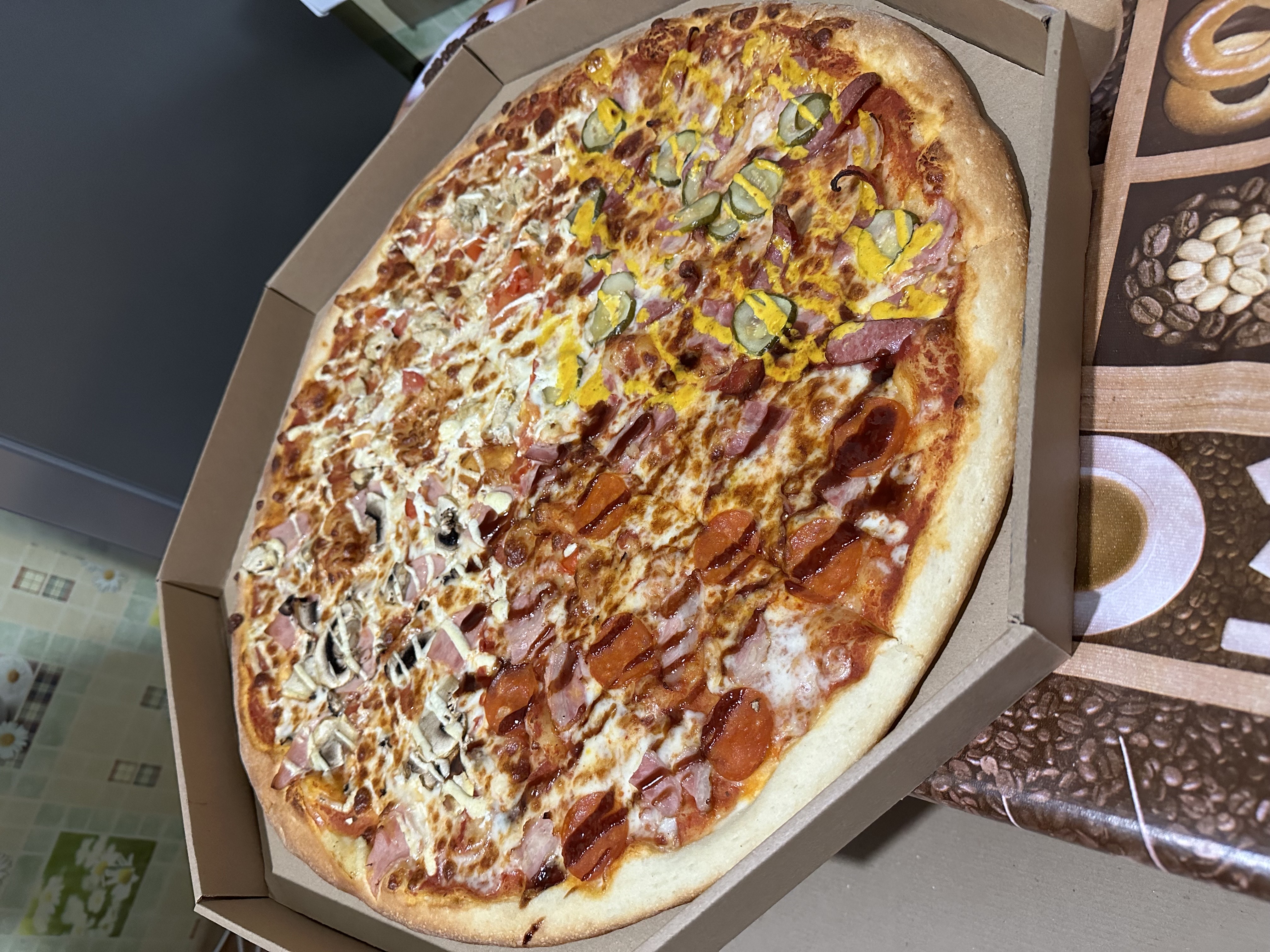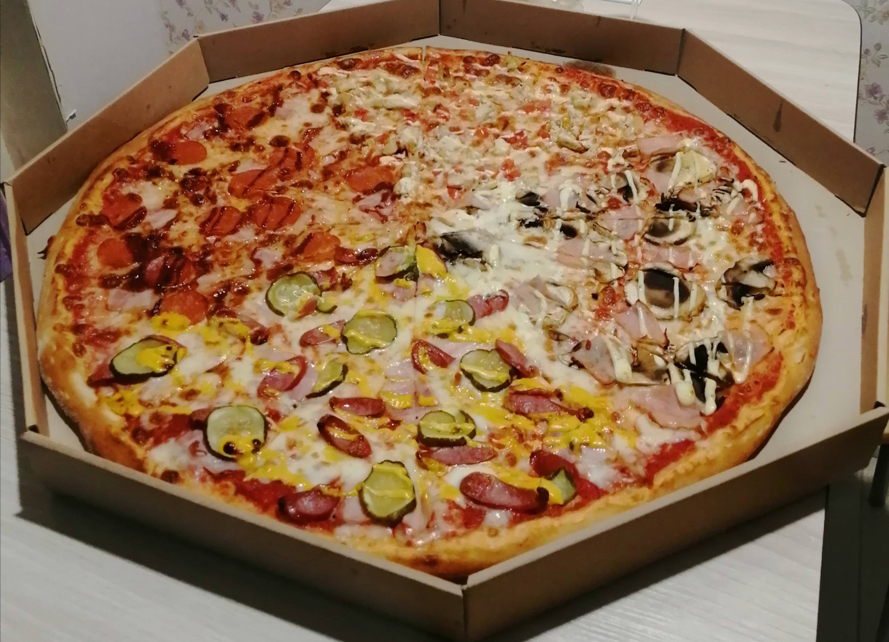 - мега-пицца "Компанейская" (60 см, 2000 г): моцарелла, пицца-соус, помидор, ветчина куриная, пепперони, бекон, лук маринованный, колбаски охотничьи, огурцы маринованные