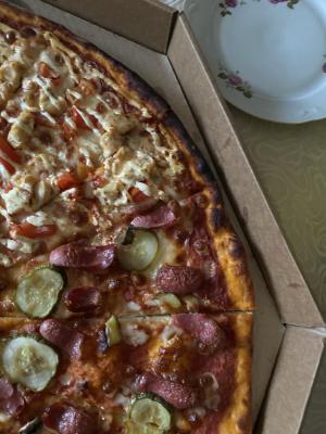 Состав: пицца-соус, моцарелла, бекон, салями, пеперони, огурец маринованный, помидор, соус горчичный
