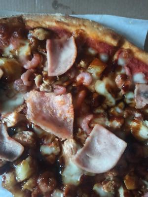 Состав: пицца-соус, моцарелла, колбаски охотничьи, пепперони, салями, курица, бекон, помидор, огурец маринованный, соус горчичный, соус барбекю, лук маринованный, сыр чеддер