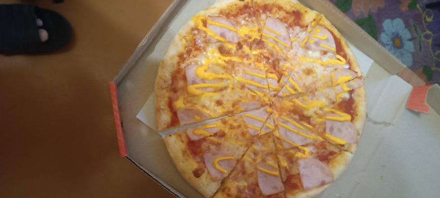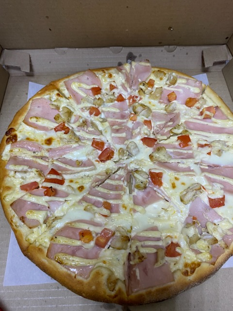 Состав: моцарелла, пицца-соус, ветчина, бекон, томат, огурец маринованный, чеддер, соус бургер