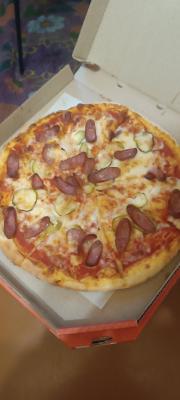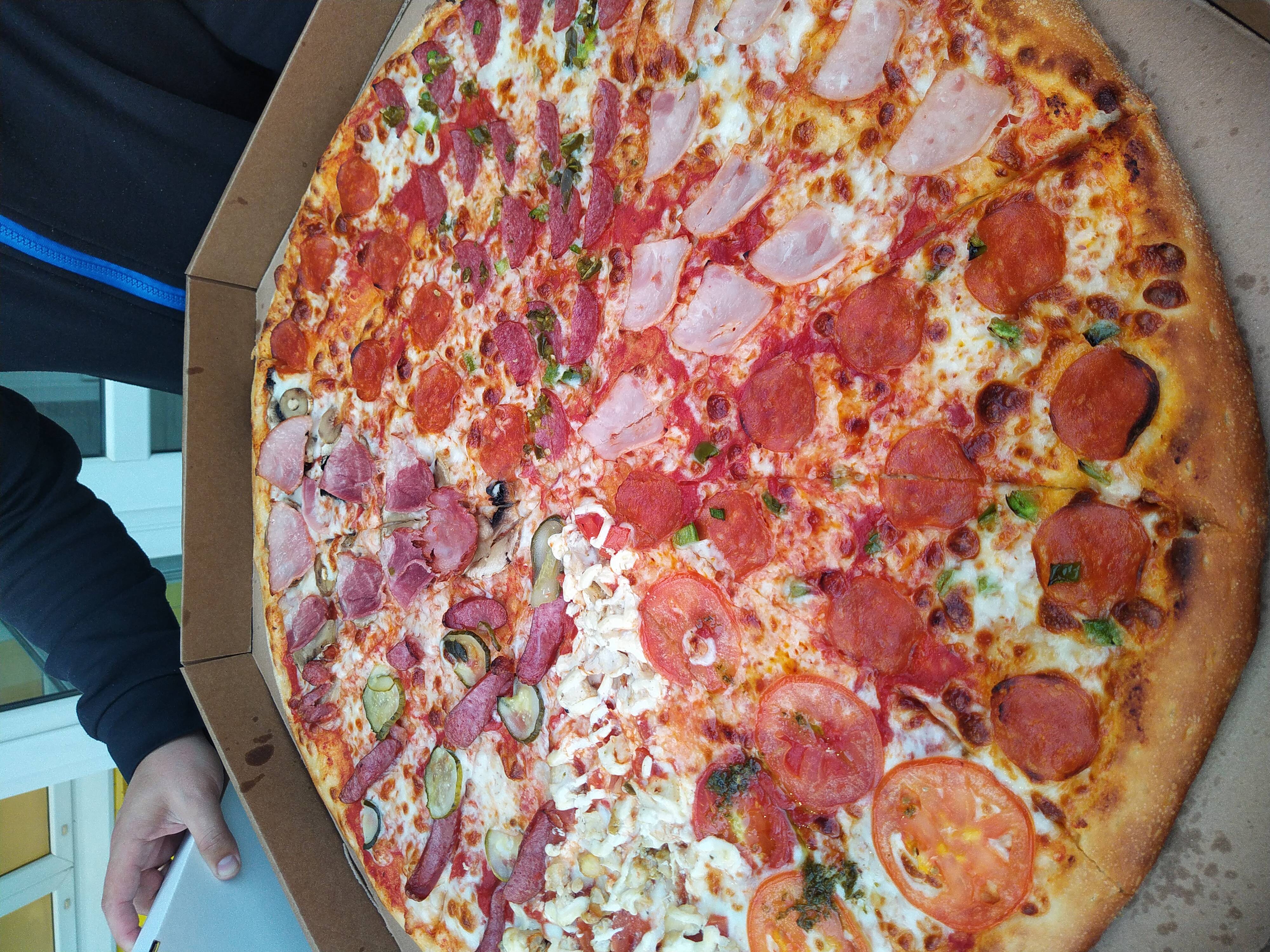 - мега-пицца "Компанейская" (60 см, 2000 г): моцарелла, пицца-соус, помидор, ветчина куриная, пепперони, бекон, лук маринованный, колбаски охотничьи, огурцы маринованные