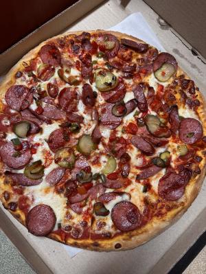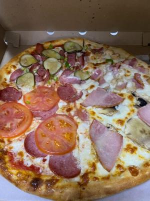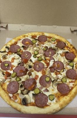 Состав: моцарелла, ветчина, грибы, колбаски охотничьи, огурец, курица, помидор, пепперони, перец сладкий, салями, перец халапеньо