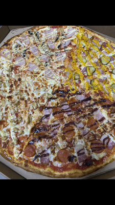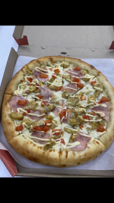 Состав: моцарелла, чесночный соус, кетчуп, ветчина, грибы, пепперони, курица, томат, фета