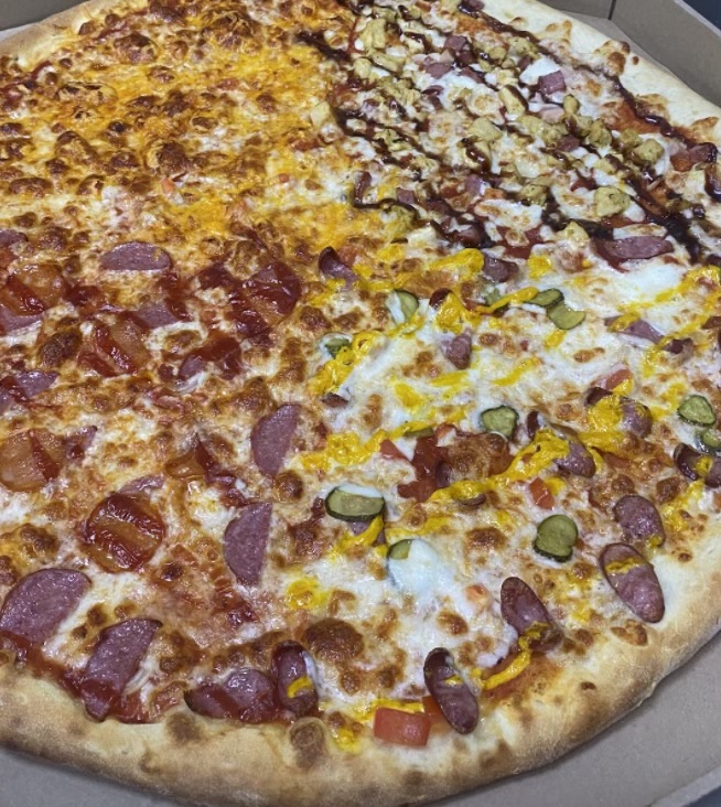 -  мега-пицца "Мясная" (60 см, 2000 г): моцарелла, пицца-соус, бекон, пепперони, курица, томат, грибы, ветчина куриная, колбаски охотничьи, огурец маринованный, соус (ранч, горчичный, барбекю)