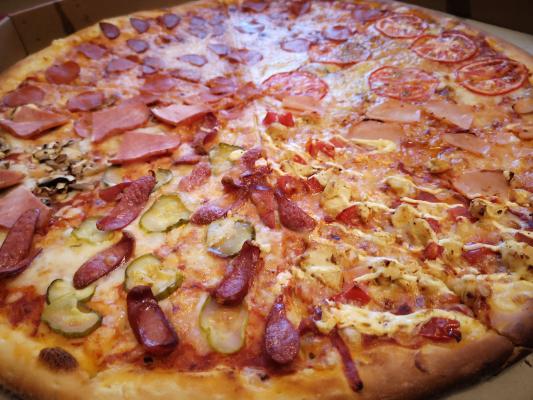 - мега-пицца "Восемь ломтиков" (60 см, 2000 г): моцарелла, ветчина, грибы, колбаски охотничьи, огурец, курица, помидор, пепперони, перец сладкий, салями, перец халапеньо