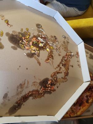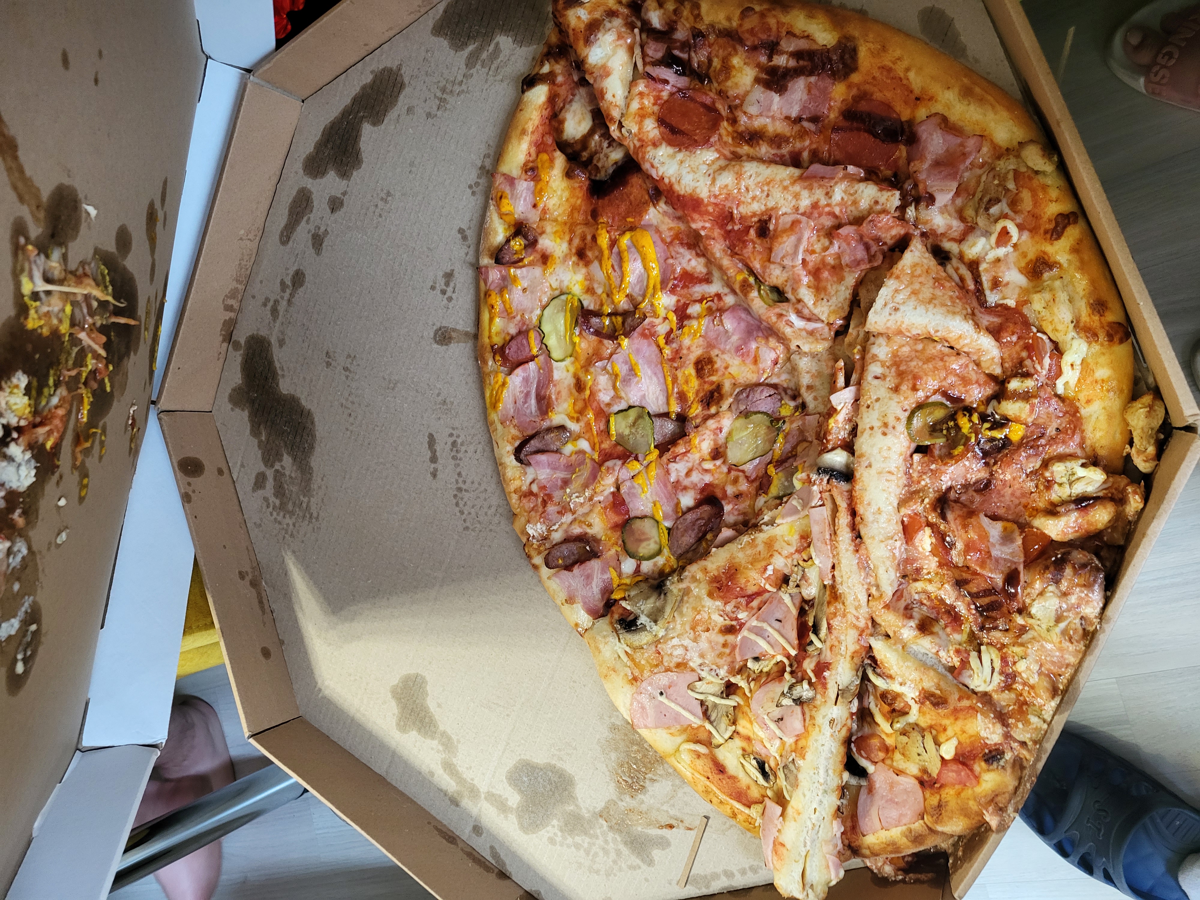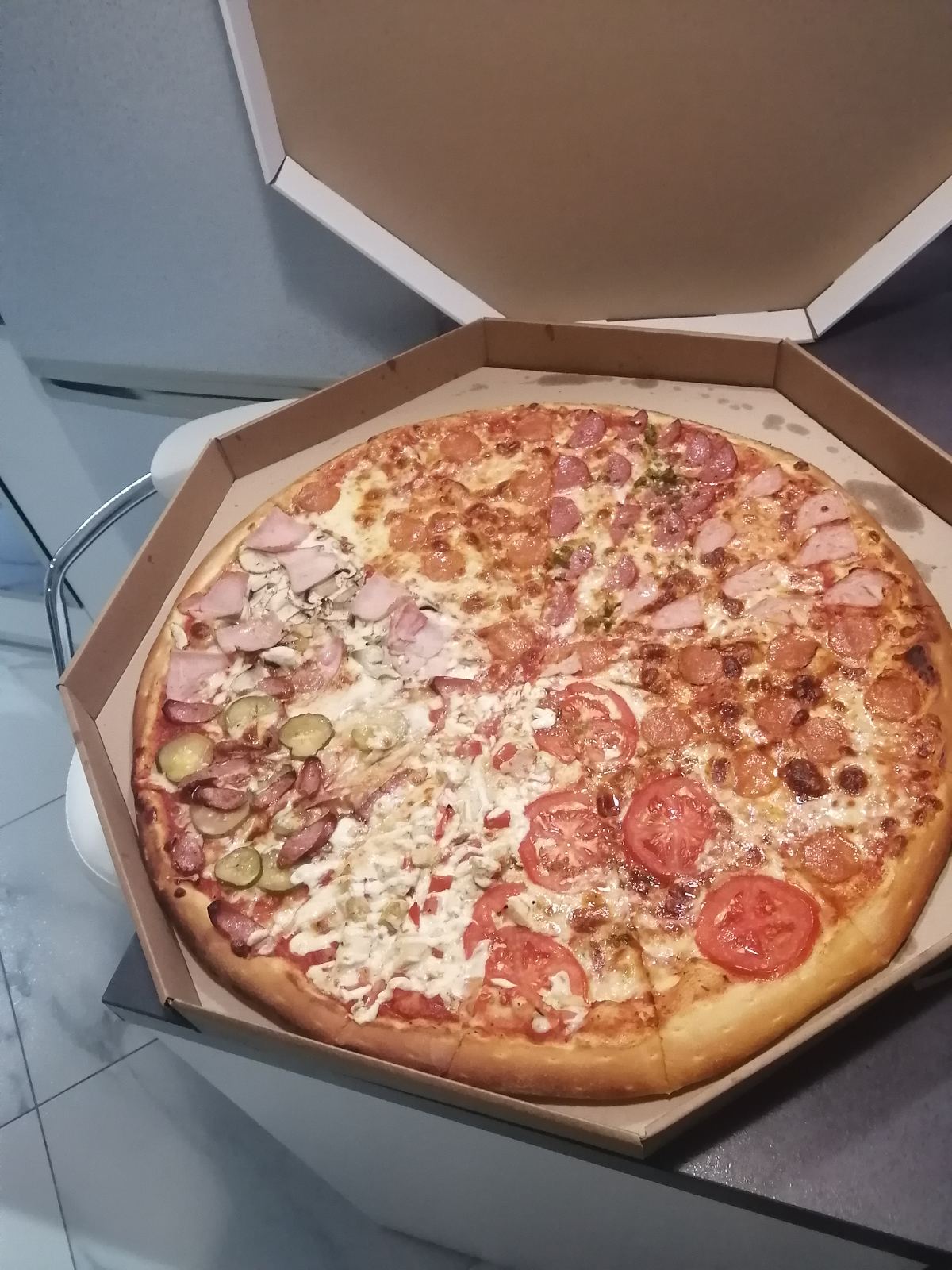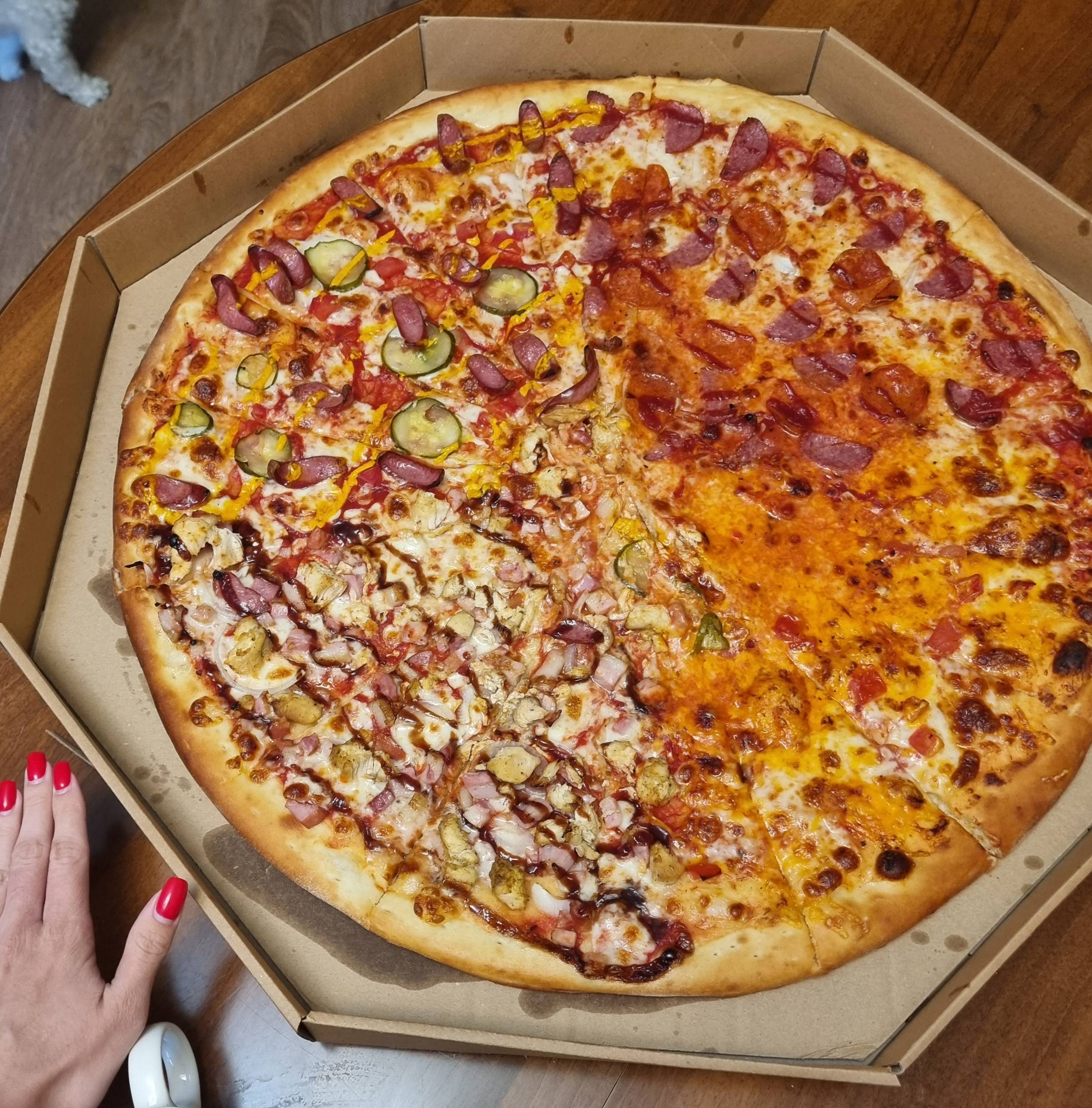 Состав: моцарелла, пицца-соус, ветчина, бекон, томат, огурец маринованный, чеддер, соус бургер