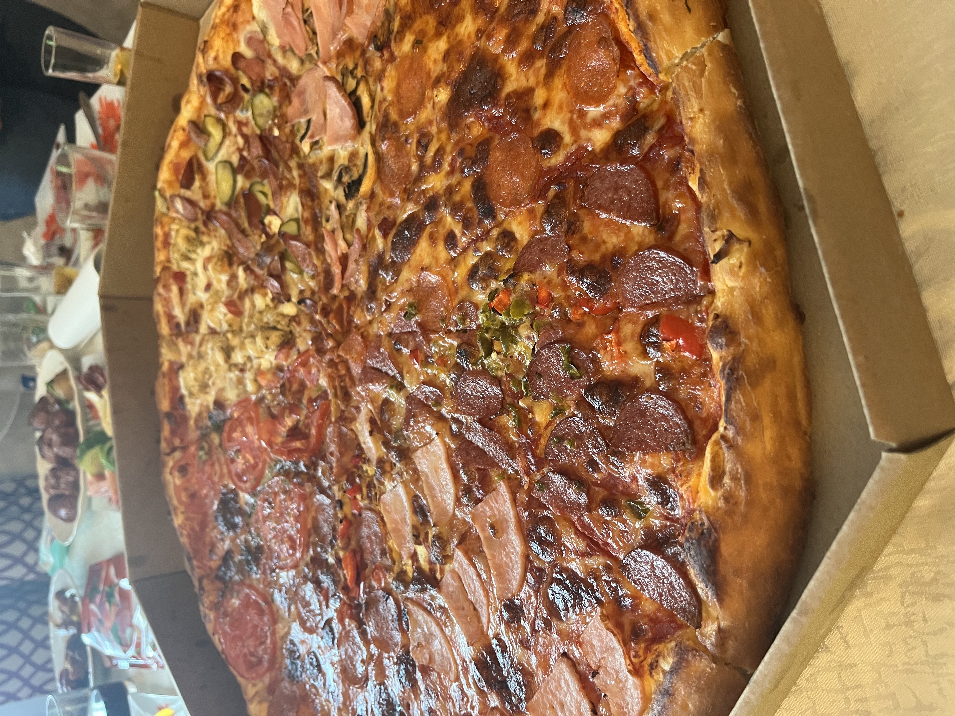 Состав: моцарелла, ветчина, грибы, колбаски охотничьи, огурец, курица, помидор, пепперони, перец сладкий, салями, перец халапеньо