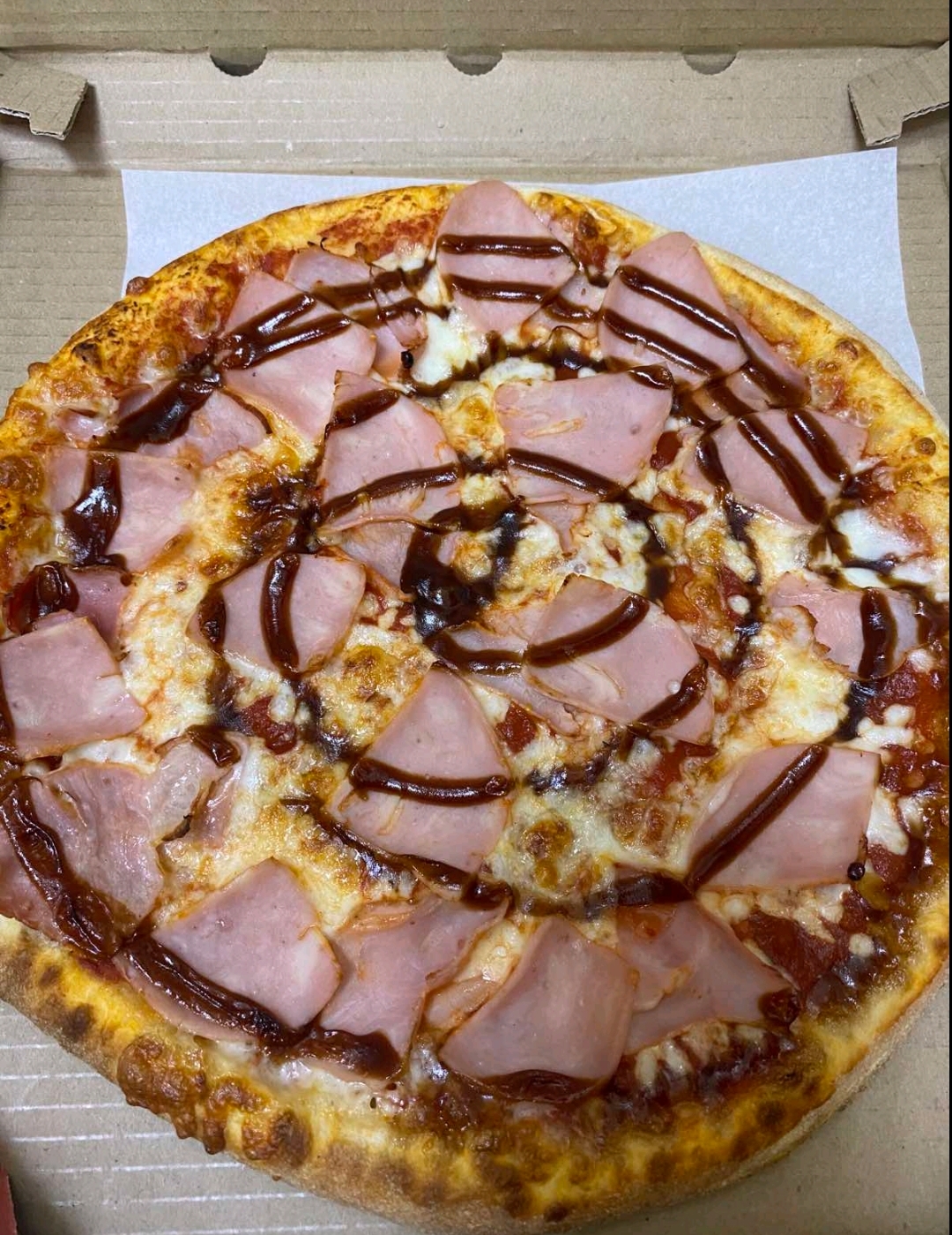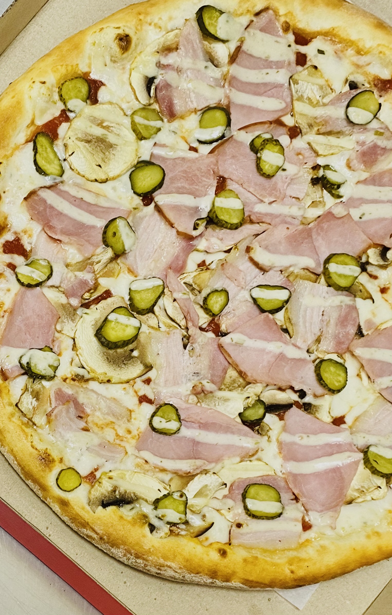 Состав: моцарелла, пицца-соус, ветчина, бекон, томат, огурец маринованный, чеддер, соус бургер