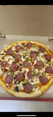 Состав: моцарелла, ветчина, грибы, колбаски охотничьи, огурец, курица, помидор, пепперони, перец сладкий, салями, перец халапеньо
