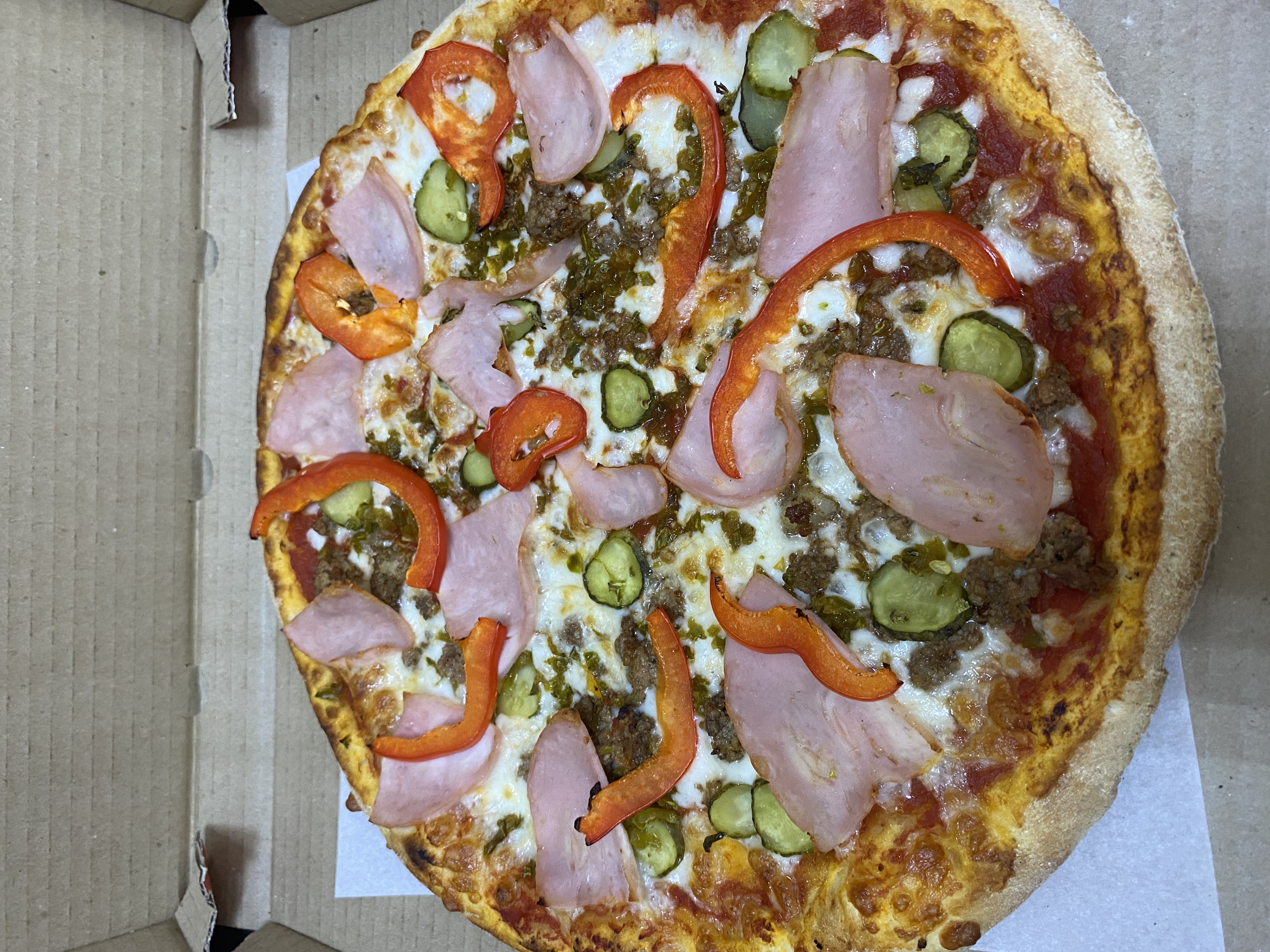 Состав: моцарелла, пицца-соус, ветчина, бекон, томат, огурец маринованный, чеддер, соус бургер