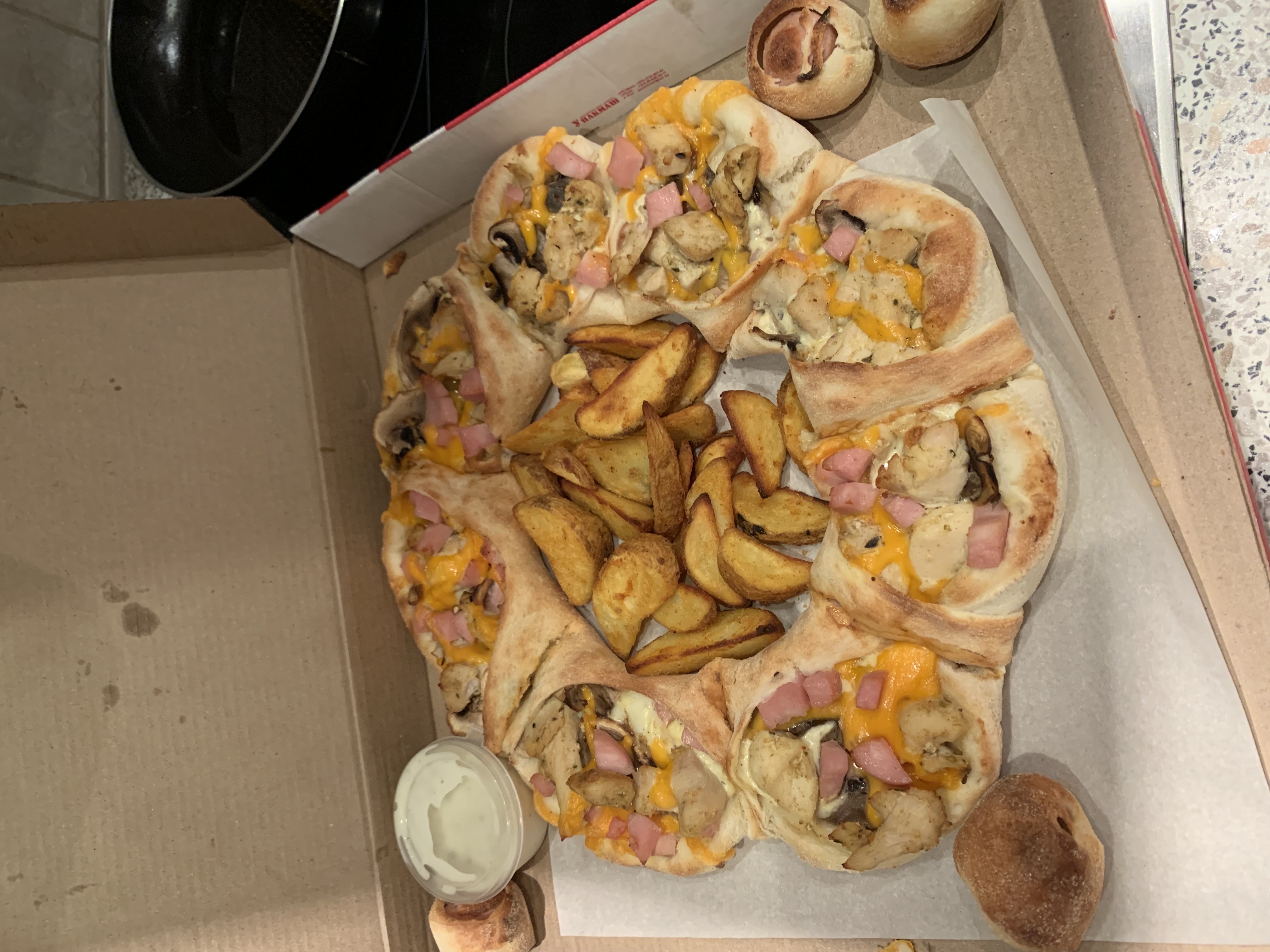 Состав: моцарелла, чесночный соус, кетчуп, ветчина, грибы, пепперони, курица, томат, фета