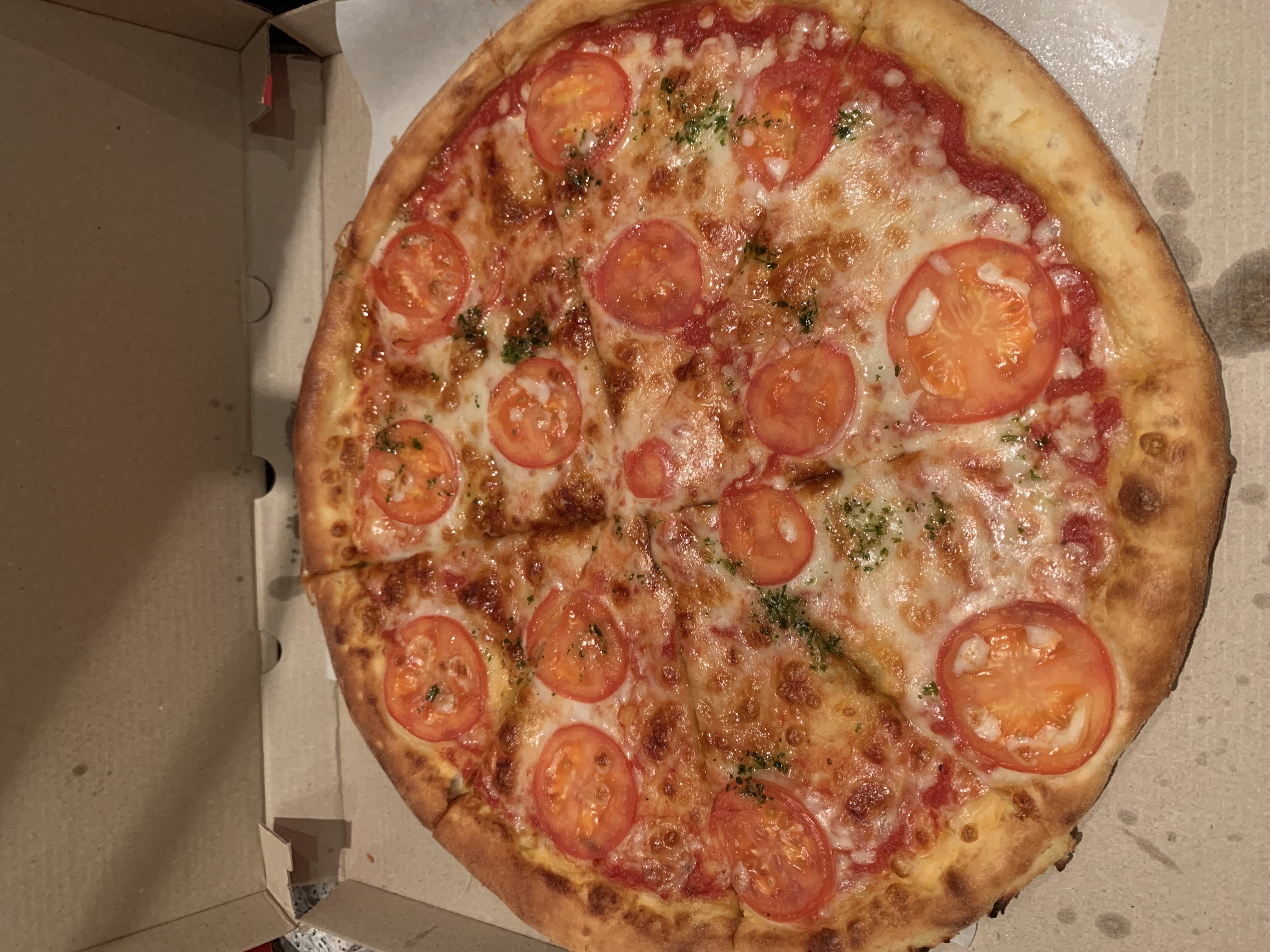 Состав: пицца-соус, моцарелла, помидор кубик, помидор слайс, соус песто