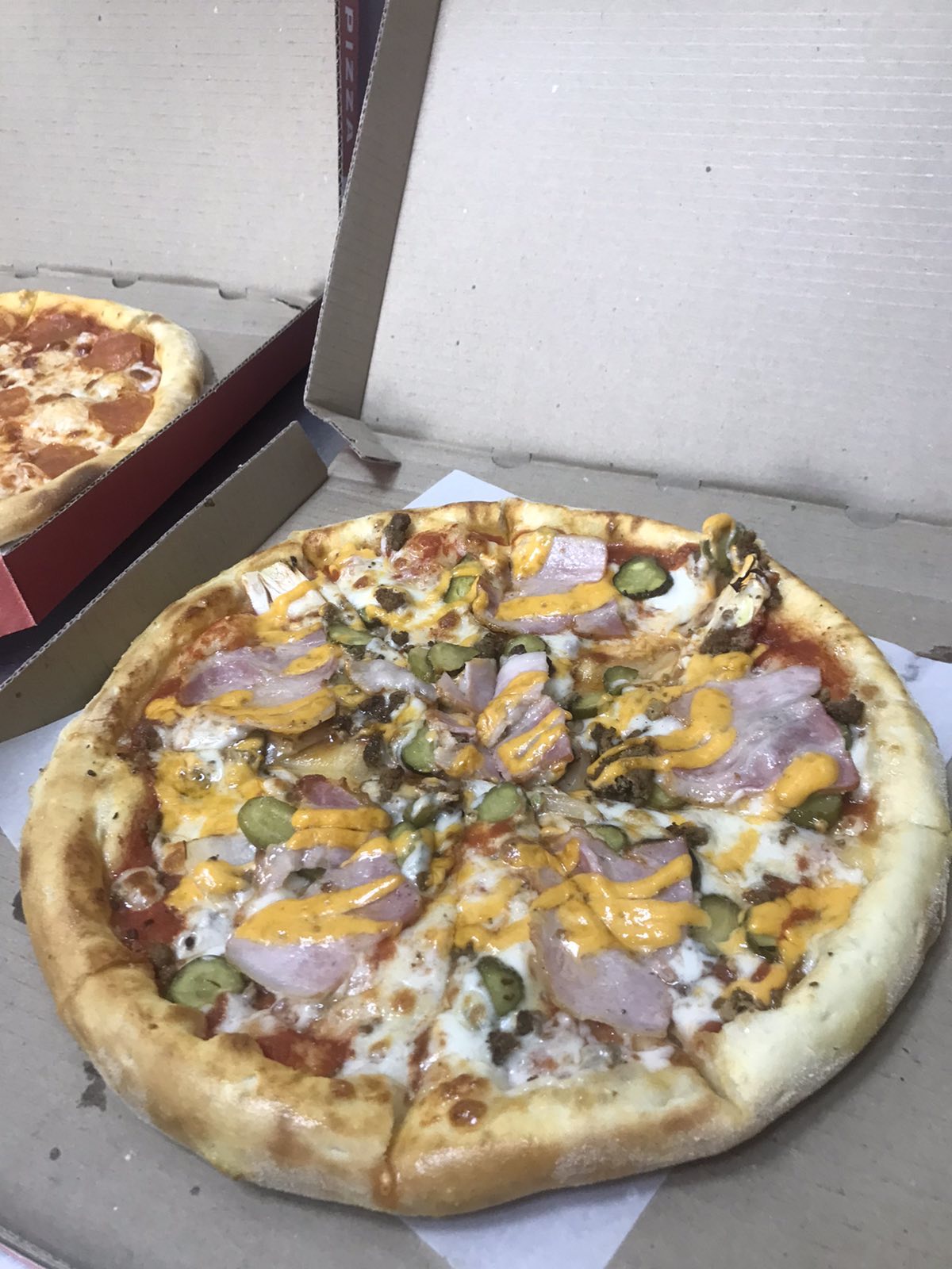 Состав: моцарелла, пицца-соус, ветчина, бекон, томат, огурец маринованный, чеддер, соус бургер