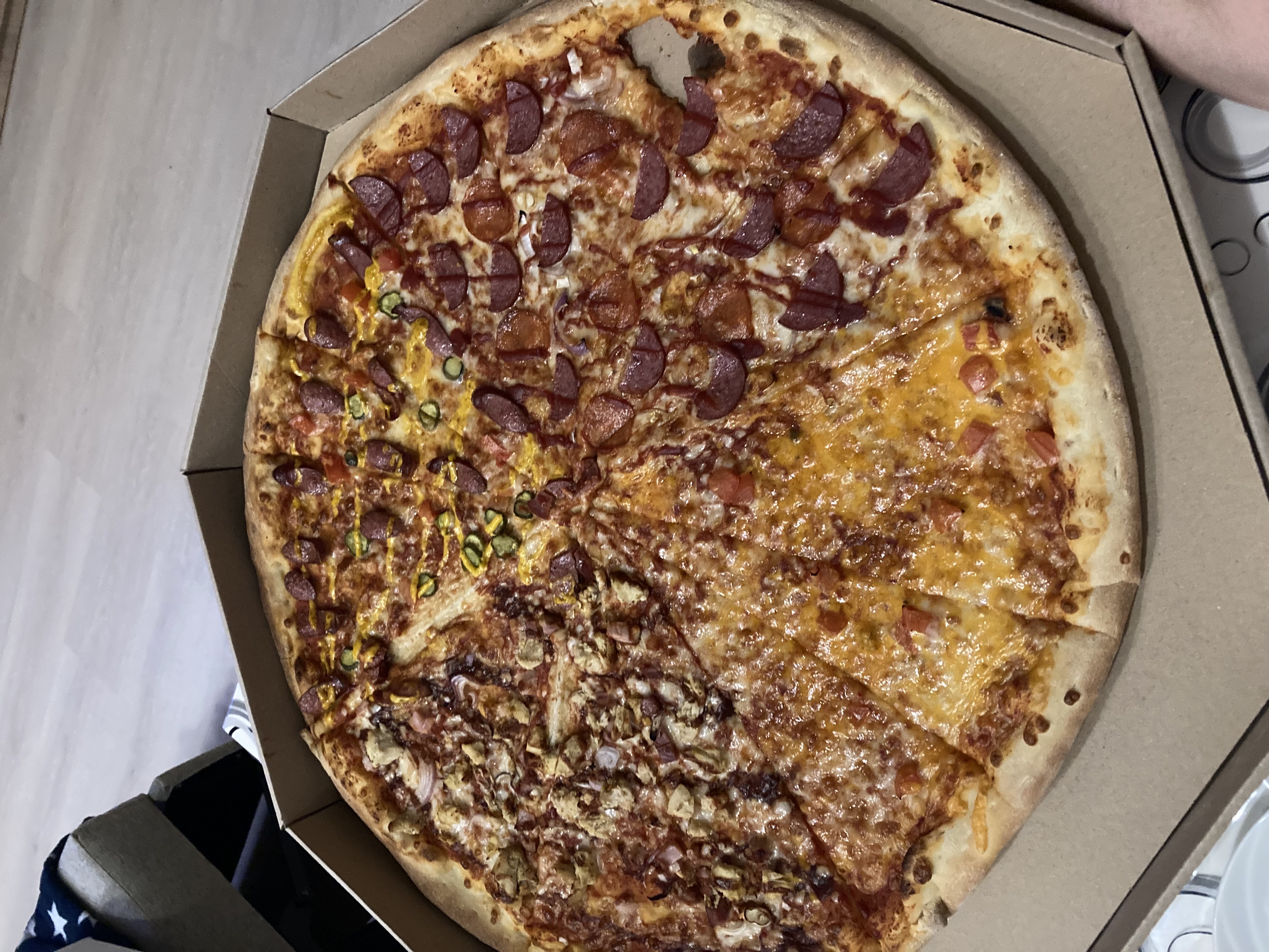 Состав: моцарелла, ветчина, грибы, колбаски охотничьи, огурец, курица, помидор, пепперони, перец сладкий, салями, перец халапеньо