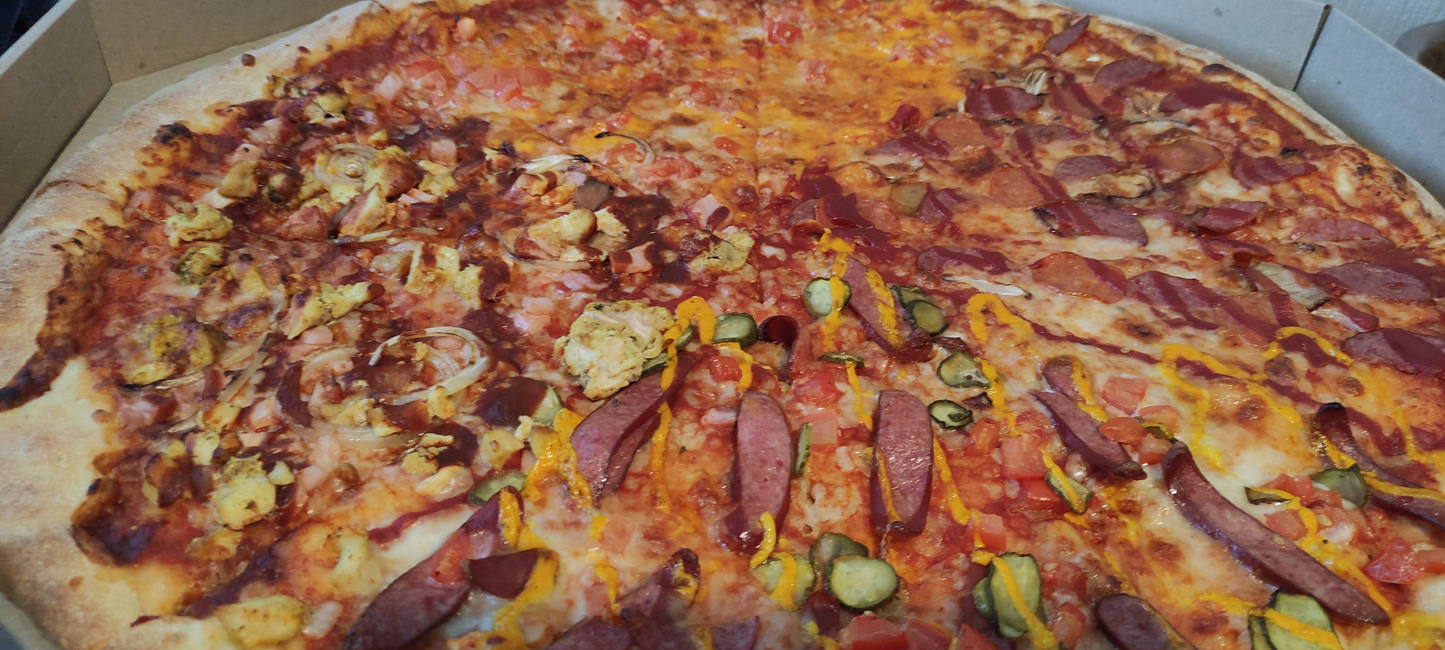 - мега-пицца "Мясная" (60 см, 2000 г): моцарелла, пицца-соус, бекон, пепперони, курица, томат, грибы, ветчина куриная, колбаски охотничьи, огурец маринованный, соус (ранч, горчичный, барбекю)