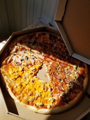 Состав: моцарелла, чесночный соус, кетчуп, ветчина, грибы, пепперони, курица, томат, фета