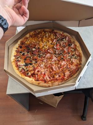 - мега-пицца "Компанейская" (60 см, 2000 г): моцарелла, пицца-соус, помидор, ветчина куриная, пепперони, бекон, лук маринованный, колбаски охотничьи, огурцы маринованные