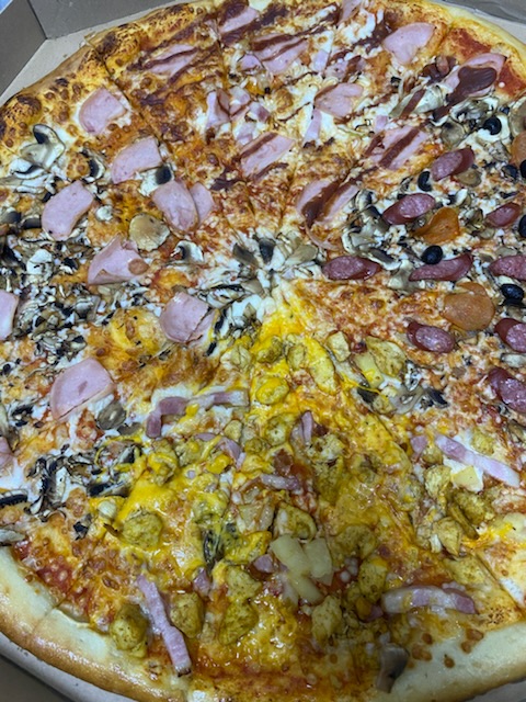 Состав: моцарелла, чесночный соус, кетчуп, ветчина, грибы, пепперони, курица, томат, фета