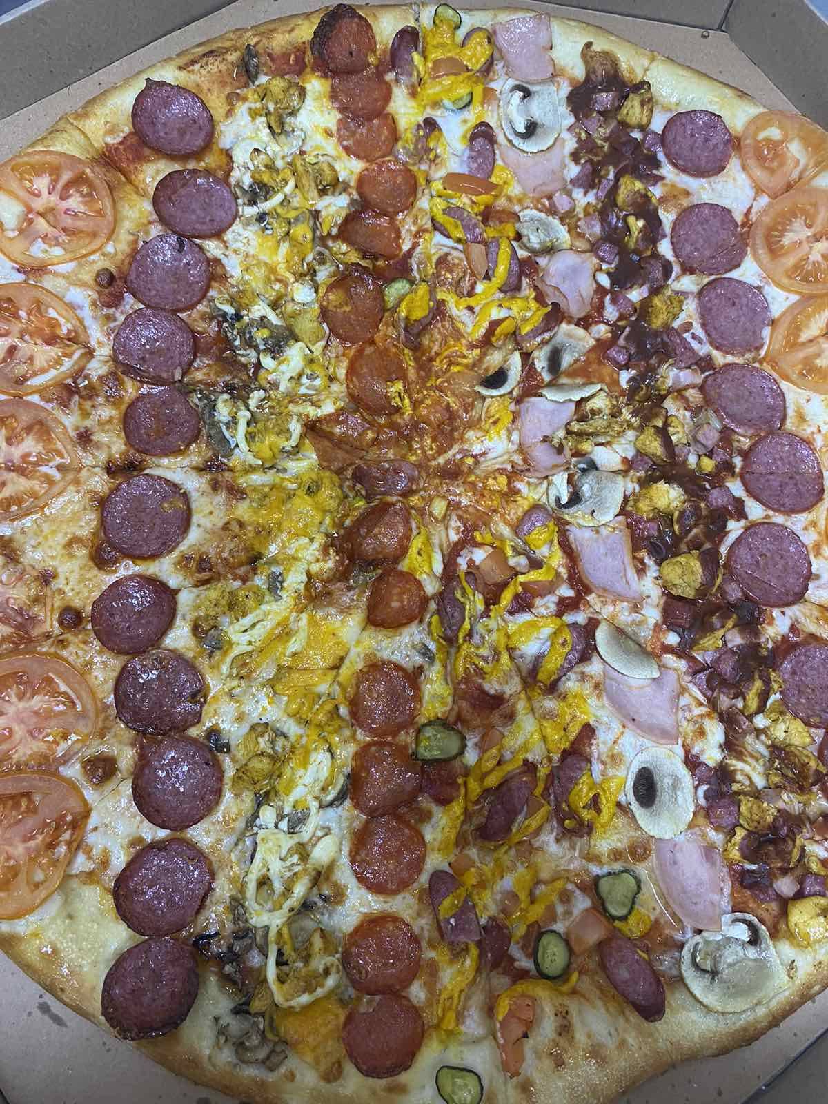 Состав: моцарелла, ветчина, грибы, колбаски охотничьи, огурец, курица, помидор, пепперони, перец сладкий, салями, перец халапеньо