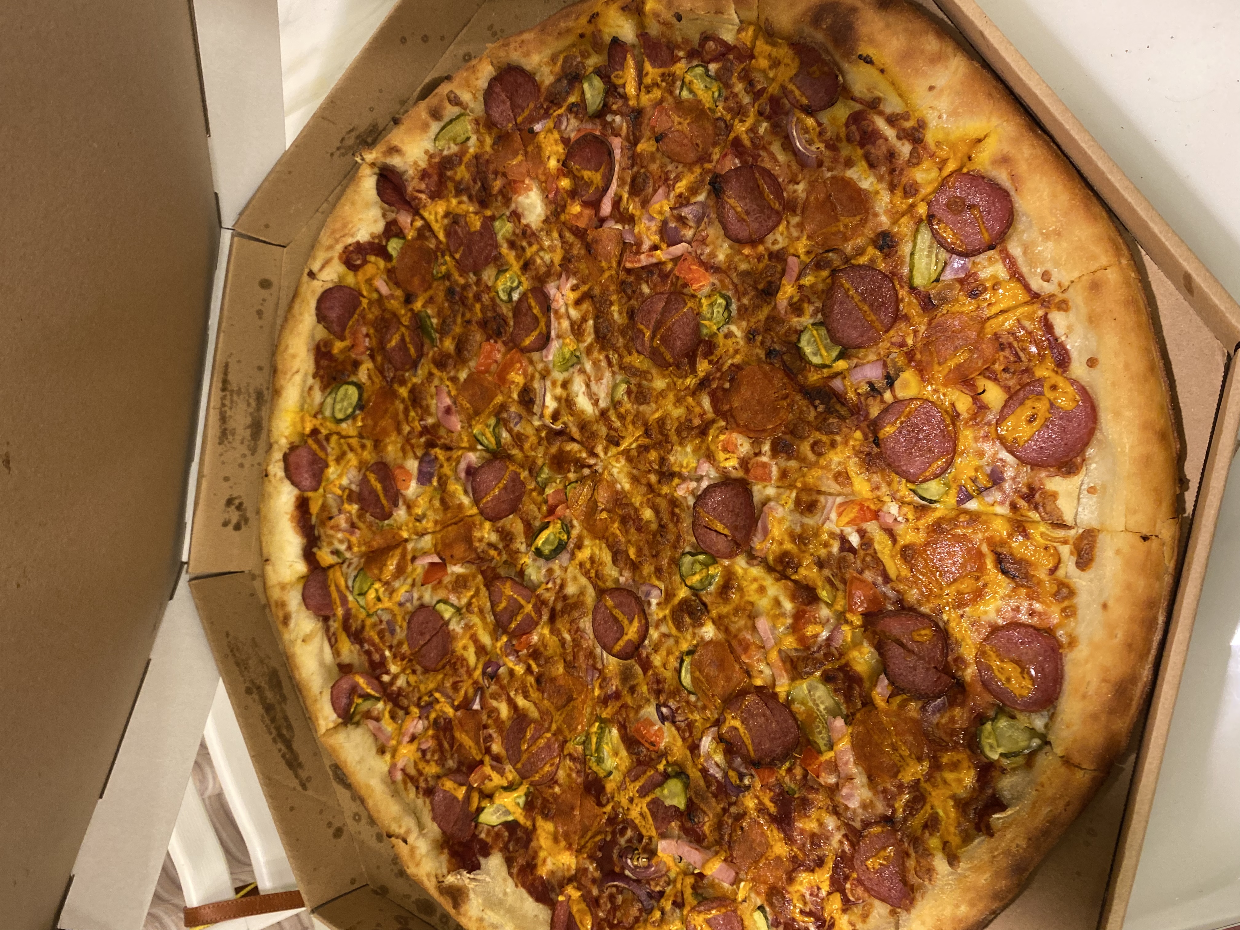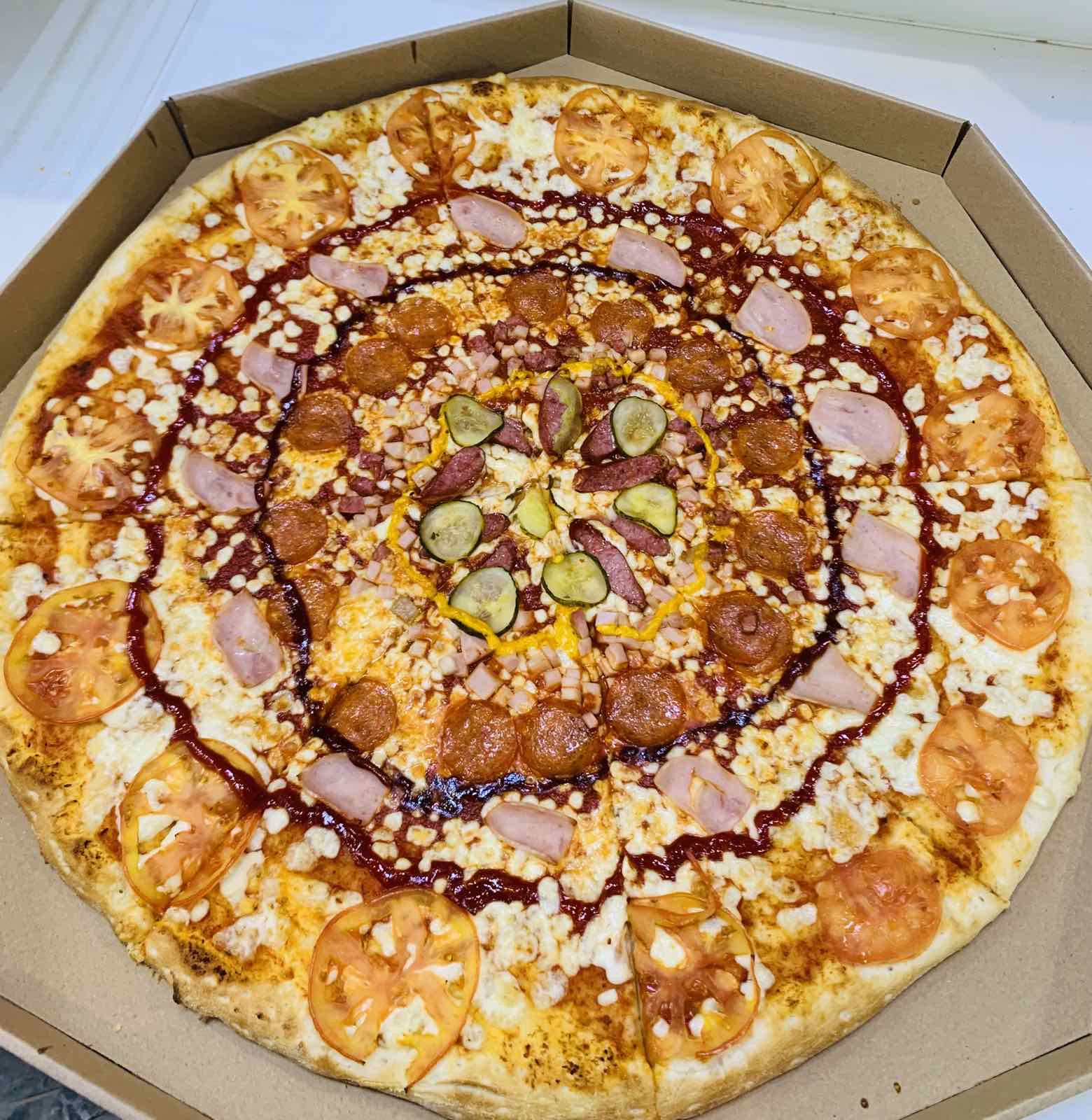 Состав: пицца-соус, моцарелла, колбаски охотничьи, пепперони, салями, курица, бекон, помидор, огурец маринованный, соус горчичный, соус барбекю, лук маринованный, сыр чеддер