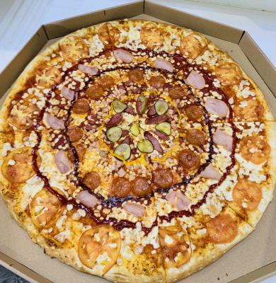 - мега-пицца "Мясная" (60 см, 2000 г): моцарелла, пицца-соус, бекон, пепперони, курица, томат, грибы, ветчина куриная, колбаски охотничьи, огурец маринованный, соус (ранч, горчичный, барбекю)