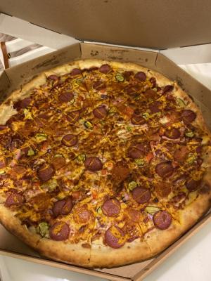 Состав: моцарелла, пицца-соус, бекон, пепперони, колбаски охотничьи, перец