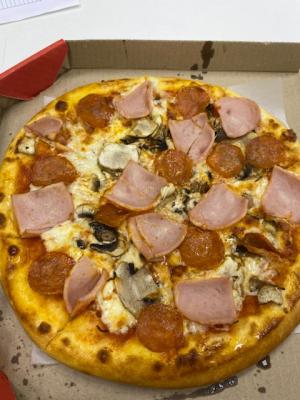 Состав: моцарелла, ветчина, грибы, колбаски охотничьи, огурец, курица, помидор, пепперони, перец сладкий, салями, перец халапеньо