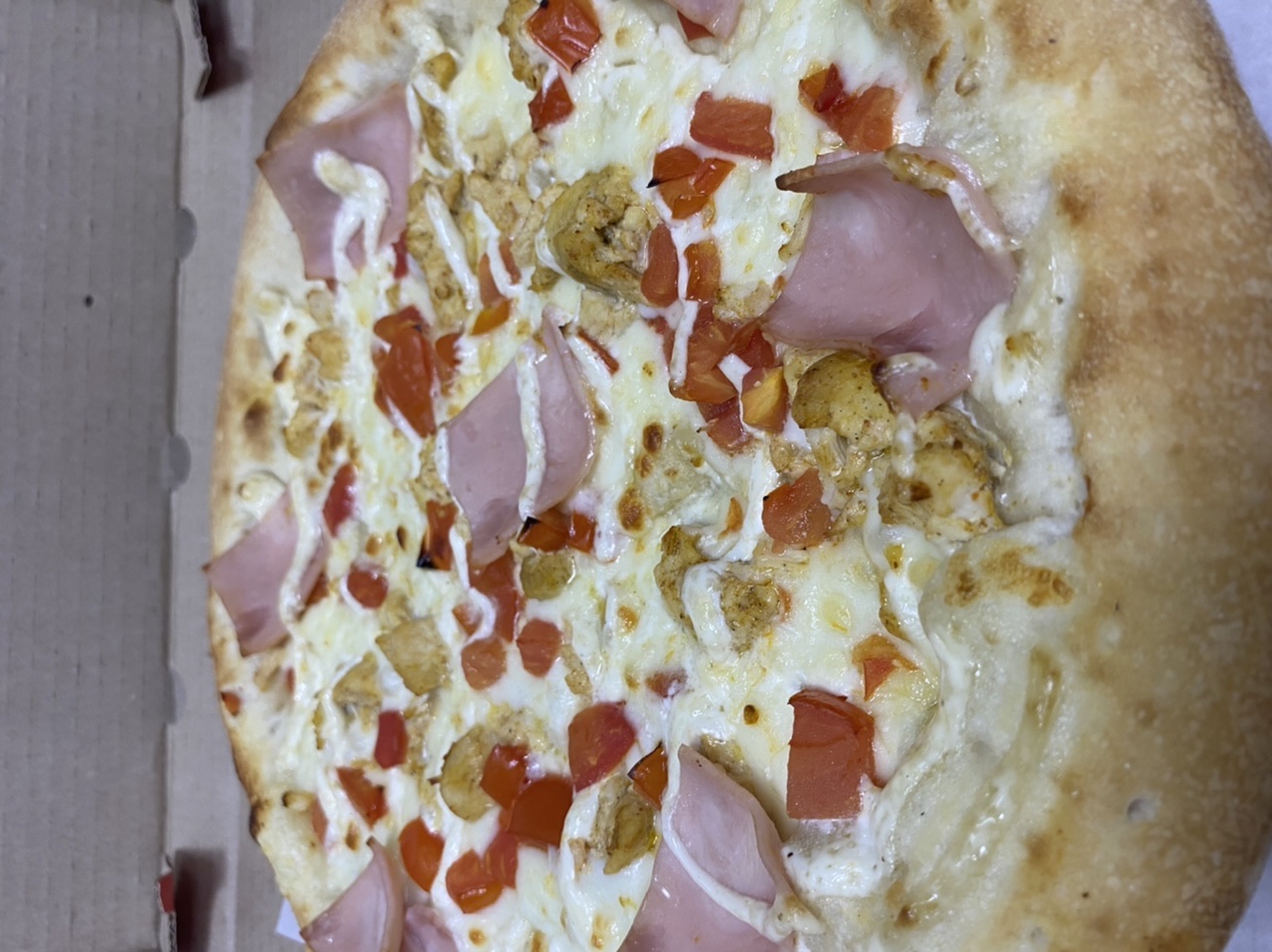 Состав: моцарелла, чесночный соус, кетчуп, ветчина, грибы, пепперони, курица, томат, фета