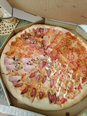 - мега-пицца "Семейная" (60 см, 2000 г): сыр моцарелла, помидор, салями, курица, огурец, ветчина, грибы, пепперони, сыр Чеддер