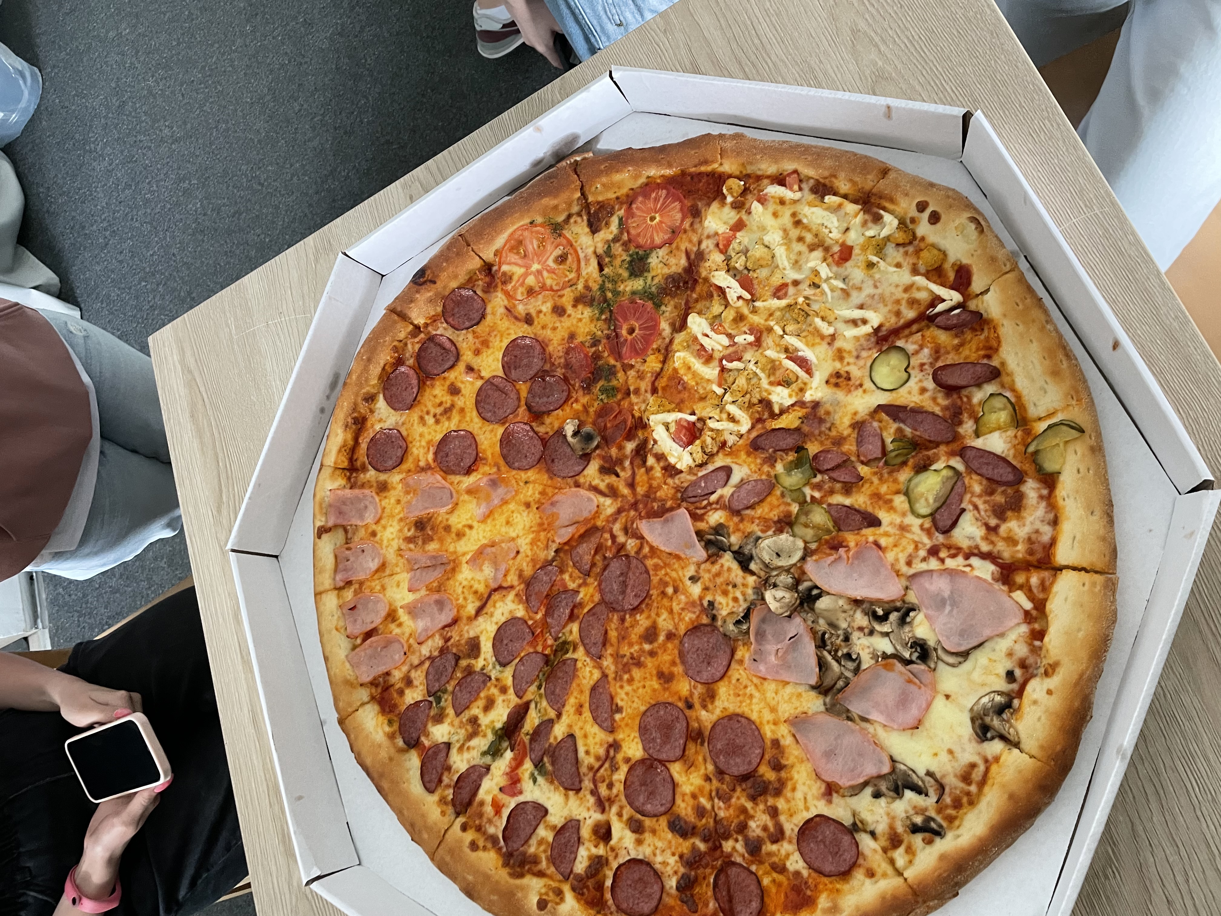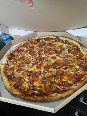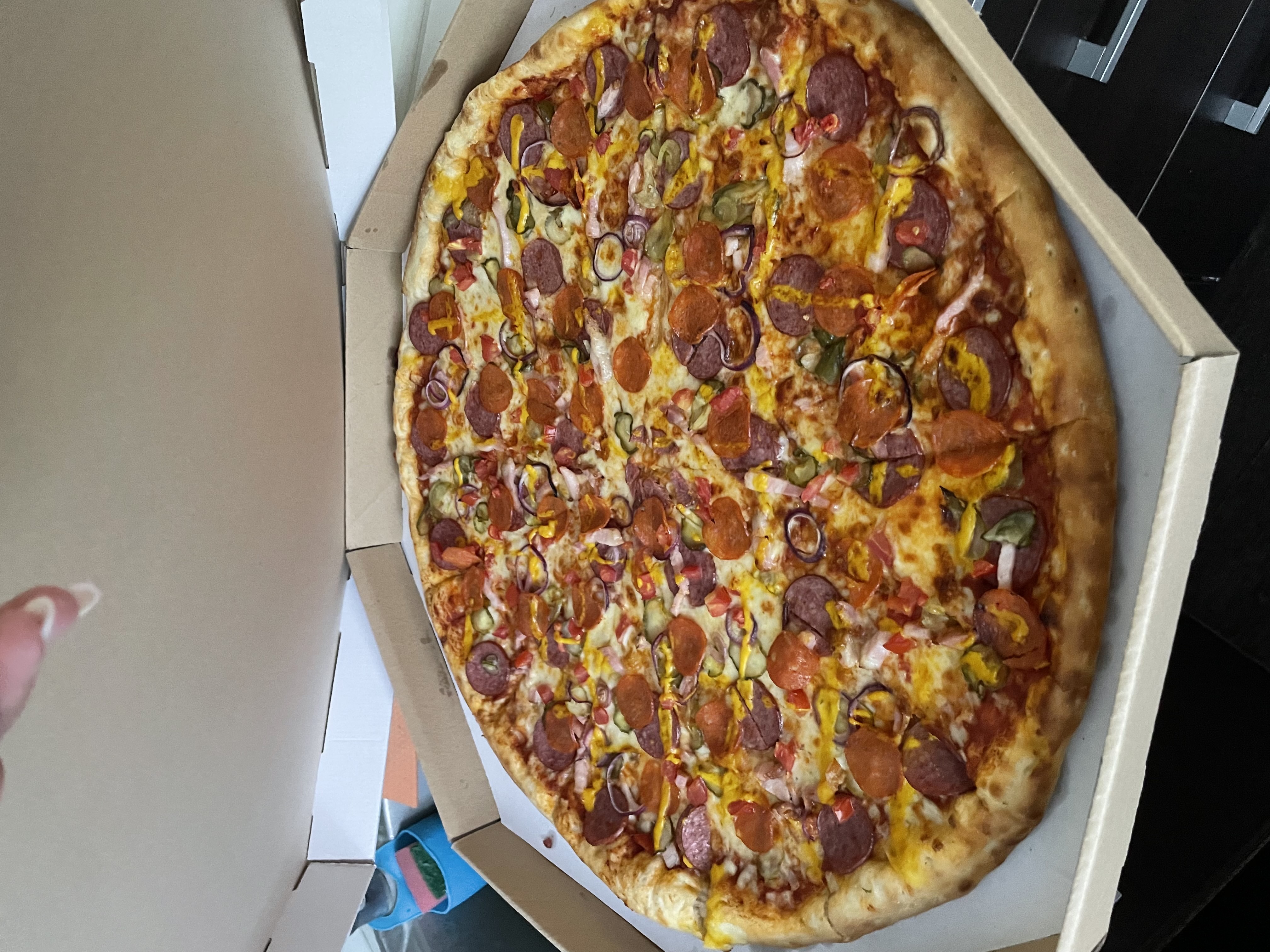 Состав: моцарелла, ветчина, грибы, колбаски охотничьи, огурец, курица, помидор, пепперони, перец сладкий, салями, перец халапеньо
