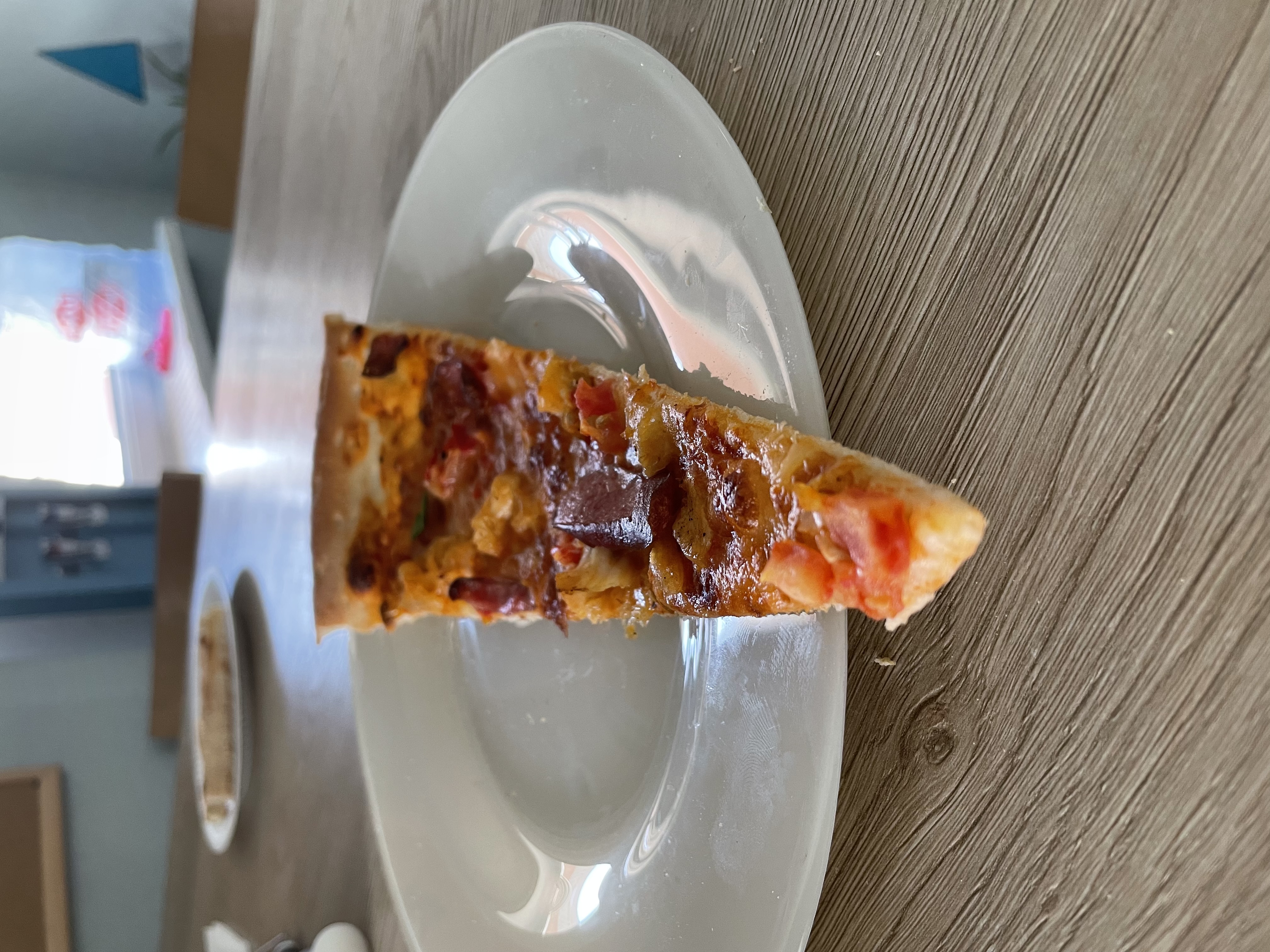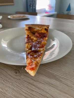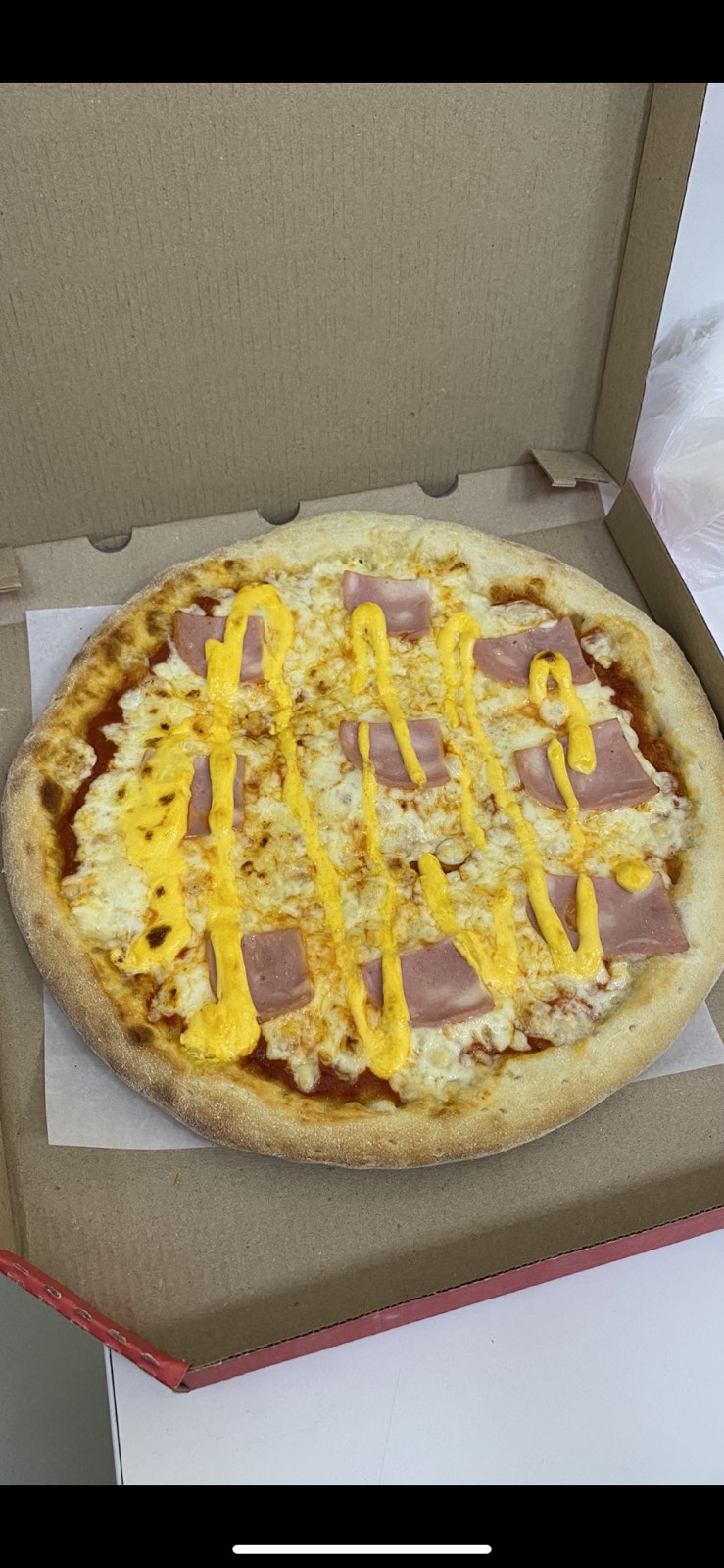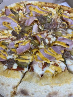 Состав: моцарелла, пицца-соус, ветчина, бекон, томат, огурец маринованный, чеддер, соус бургер