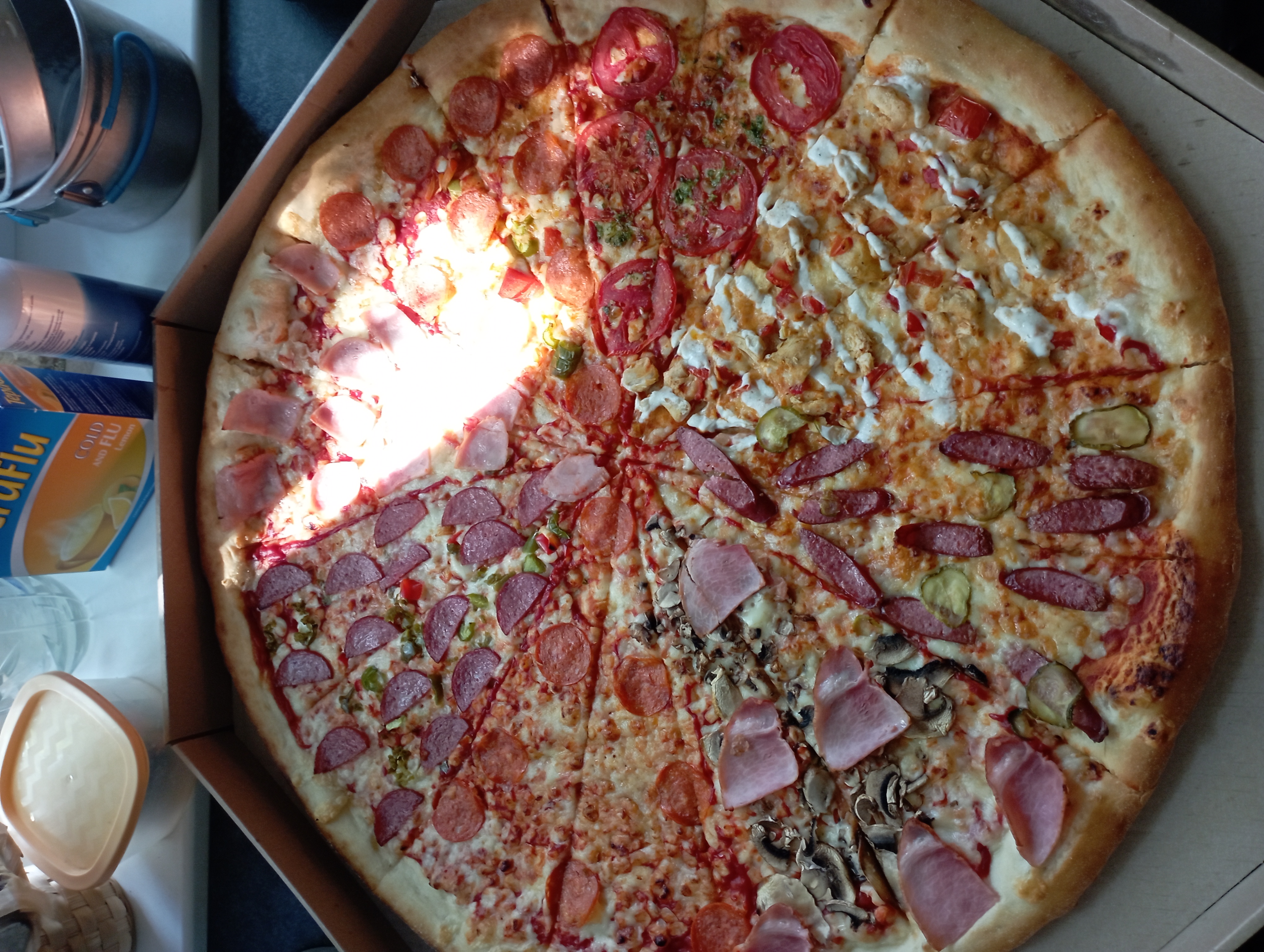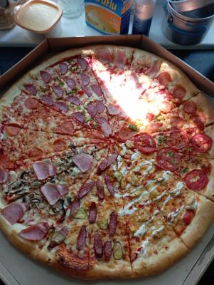 - мега-пицца "Восемь ломтиков" (60 см, 2000 г): моцарелла, ветчина, грибы, колбаски охотничьи, огурец, курица, помидор, пепперони, перец сладкий, салями, перец халапеньо