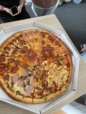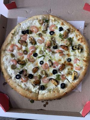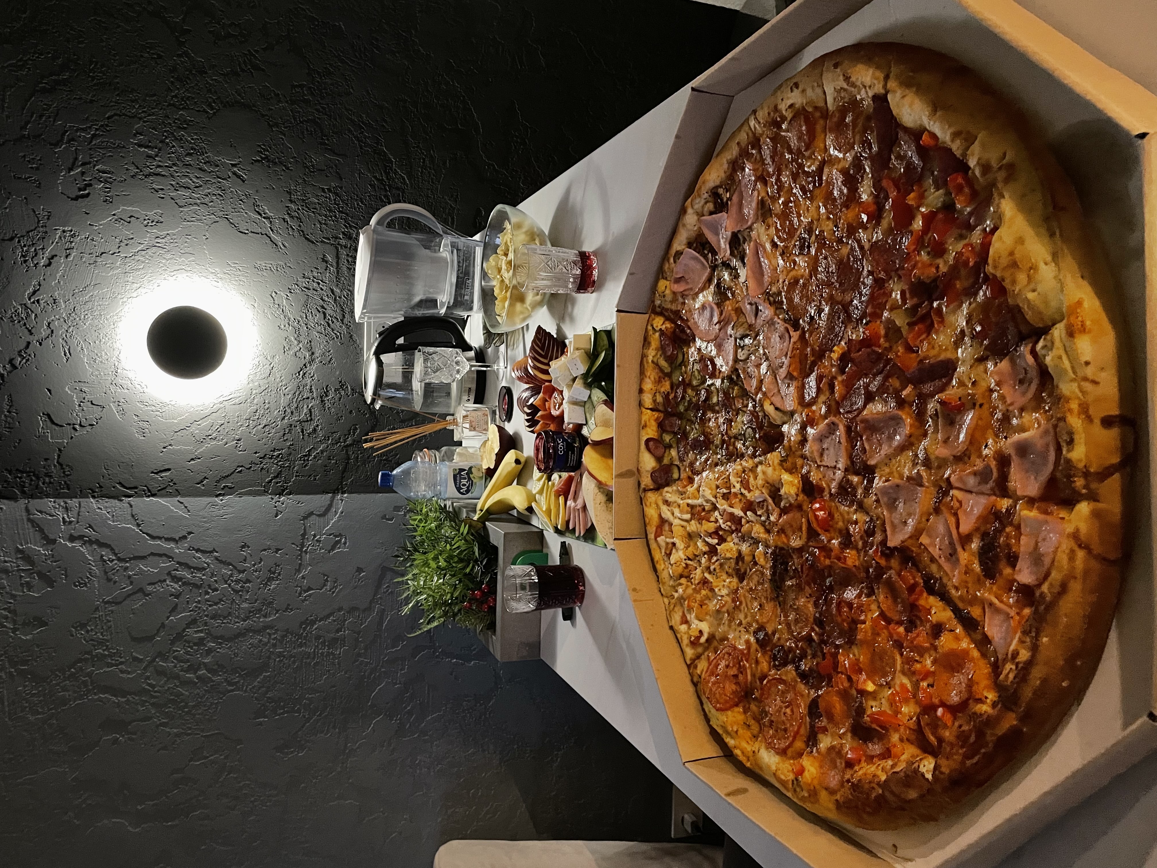 - мега-пицца "Компанейская" (60 см, 2000 г): моцарелла, пицца-соус, помидор, ветчина куриная, пепперони, бекон, лук маринованный, колбаски охотничьи, огурцы маринованные