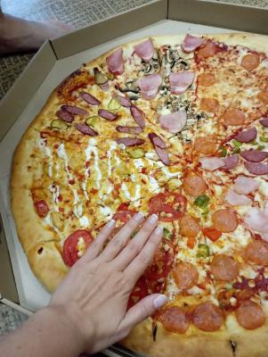 - мега-пицца "Семейная" (60 см, 2000 г): сыр моцарелла, помидор, салями, курица, огурец, ветчина, грибы, пепперони, сыр Чеддер