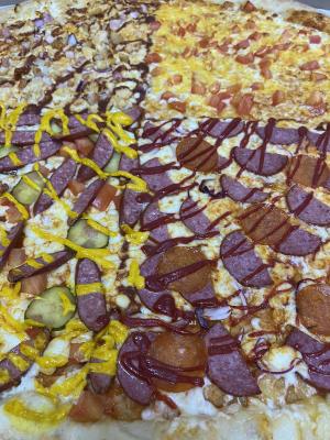 Состав: пицца-соус, моцарелла, колбаски охотничьи, пепперони, салями, курица, бекон, помидор, огурец маринованный, соус горчичный, соус барбекю, лук маринованный, сыр чеддер